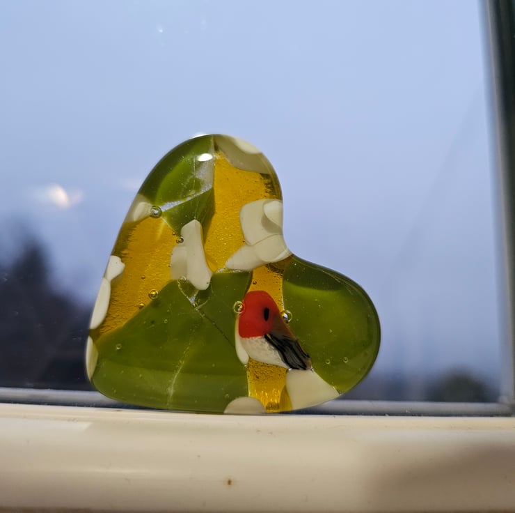 A perfect small gift to show someone you care for them. Or beautiful to keep or yourself. Many people find comfort in having an item to handle in their pocket. Hand cut and kiln fused, a unique item. Very tactile lightly textured underneath and glossy smooth on top. Will arrive wrapped in tissue and in a plain white box tied with ribbon. This heart features a cute little robin. It can be posted directly to the gift recipient with a printed message of your choice. Approximately 5cm/2" at the widest point. The gift box is 6cm/2.5" square. Please note outer packaging may be recycled.