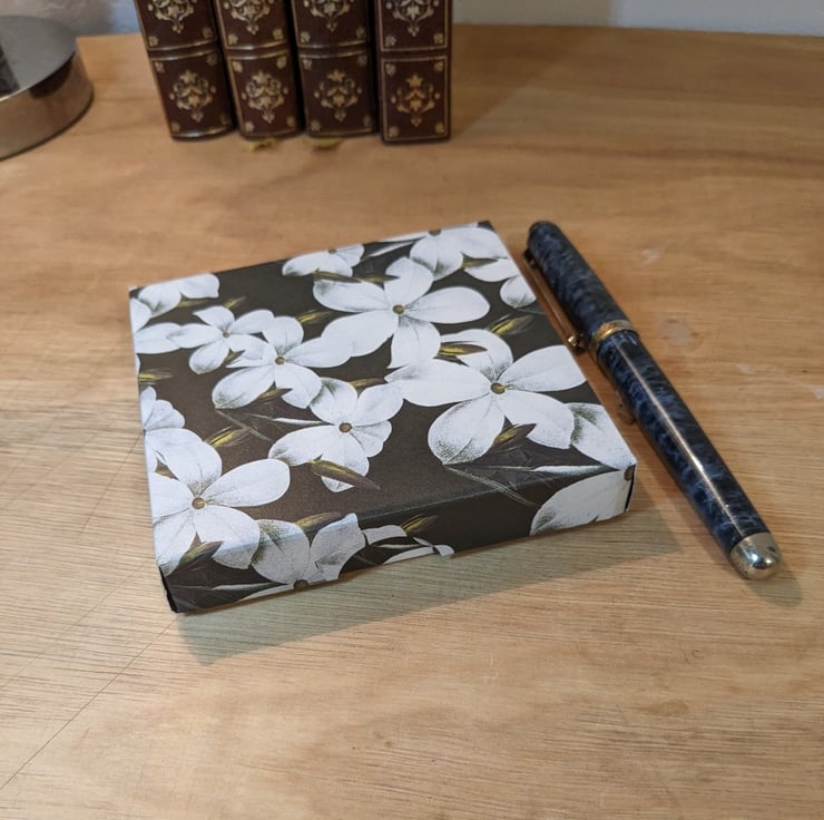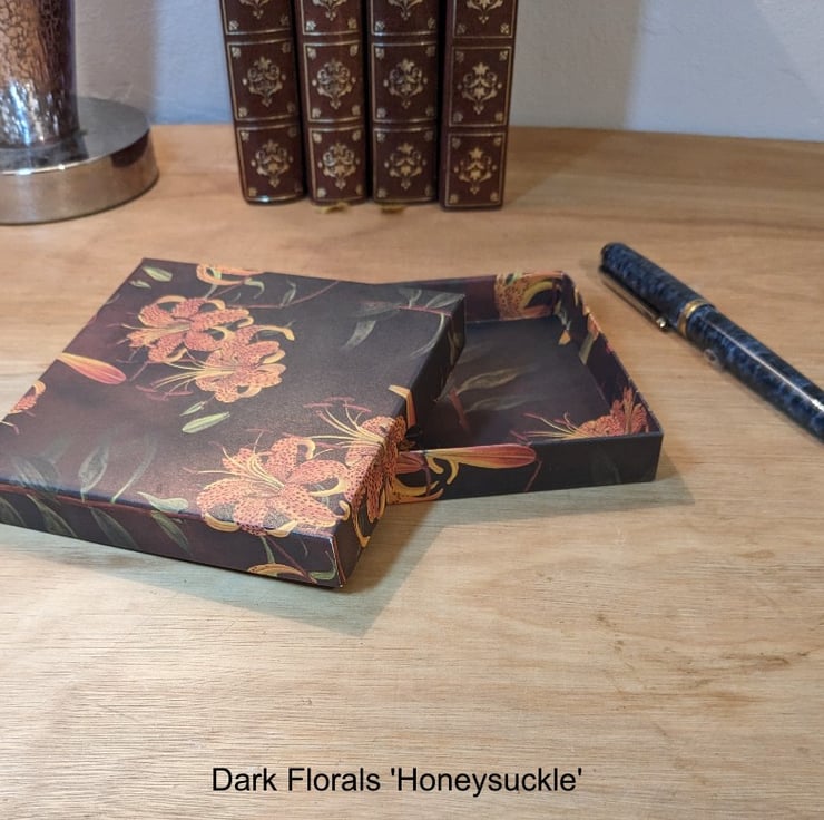 A pair of ultra-thin, handmade gift boxes with separate lids based on the Natural History Museum 'Dark Florals' series of beautiful decorative papers. This set features 'Jasmine' and 'Honeysuckle'.