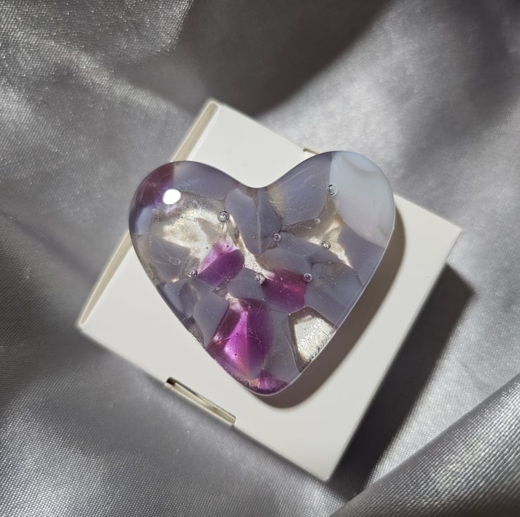A perfect small gift to show someone you care for them. Or beautiful to keep or yourself. Many people find comfort in having an item to handle in their pocket. Hand cut and kiln fused, a unique item. Very tactile lightly textured underneath and glossy smooth on top. Will arrive wrapped in tissue and in a plain white box tied with ribbon. It can be posted directly to the gift recipient with a printed message of your choice. Approximately 5cm/2" at the widest point. The gift box is 6cm/2.5" square. Please note outer packaging may be recycled.