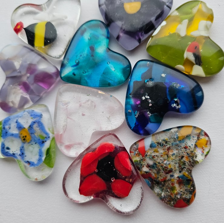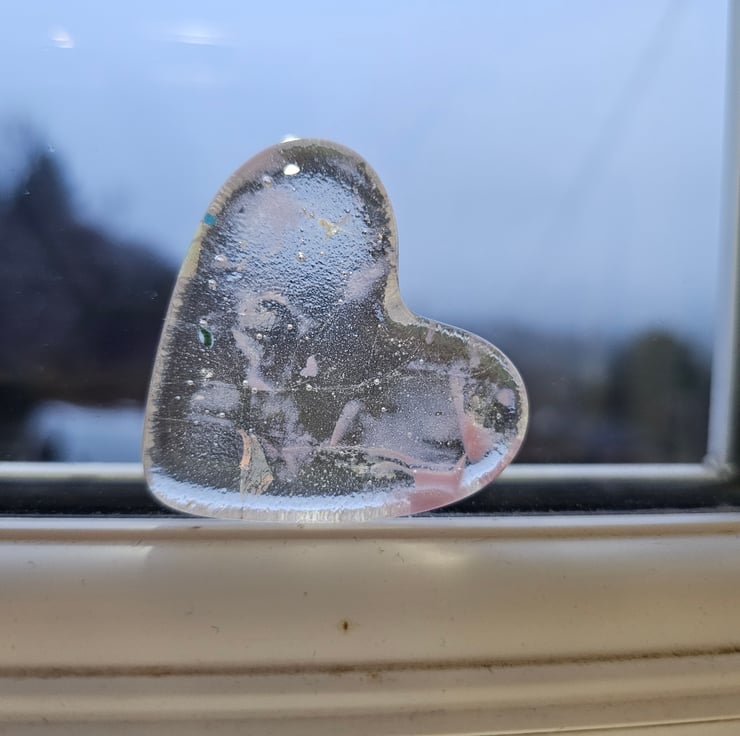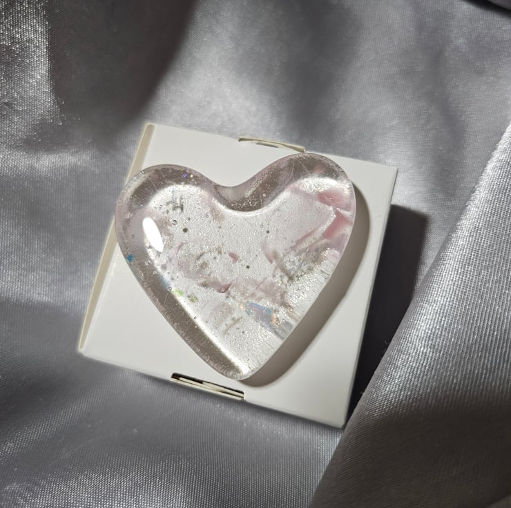 A perfect small gift to show someone you care for them. Or beautiful to keep or yourself. Many people find comfort in having an item to handle in their pocket. Hand cut and kiln fused, a unique item. Very tactile lightly textured underneath and glossy smooth on top. Will arrive wrapped in tissue and in a plain white box tied with ribbon. It can be posted directly to the gift recipient with a printed message of your choice. Approximately 5cm/2" at the widest point. The gift box is 6cm/2.5" square. Please note outer packaging may be recycled.
