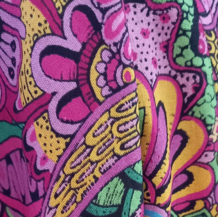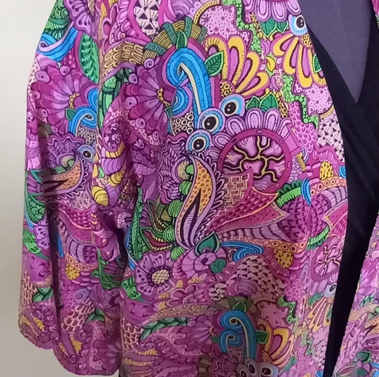 Stunning handmade loose fitting kimono style jacket made using beautiful light cotton fabric. The print is a gorgeous bright pink floral with all sorts of swirls and leaves. The loose fit of the jacket makes it very comfortable to wear.