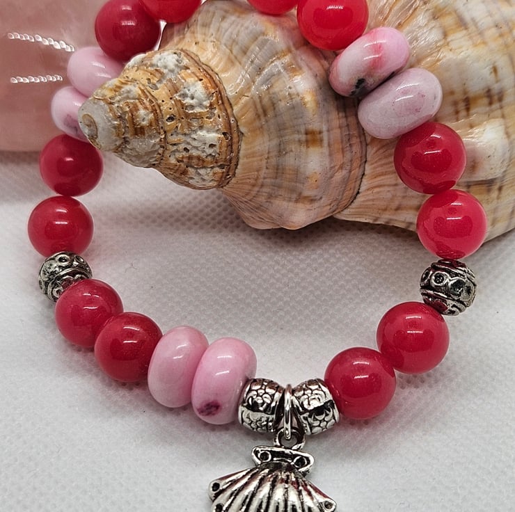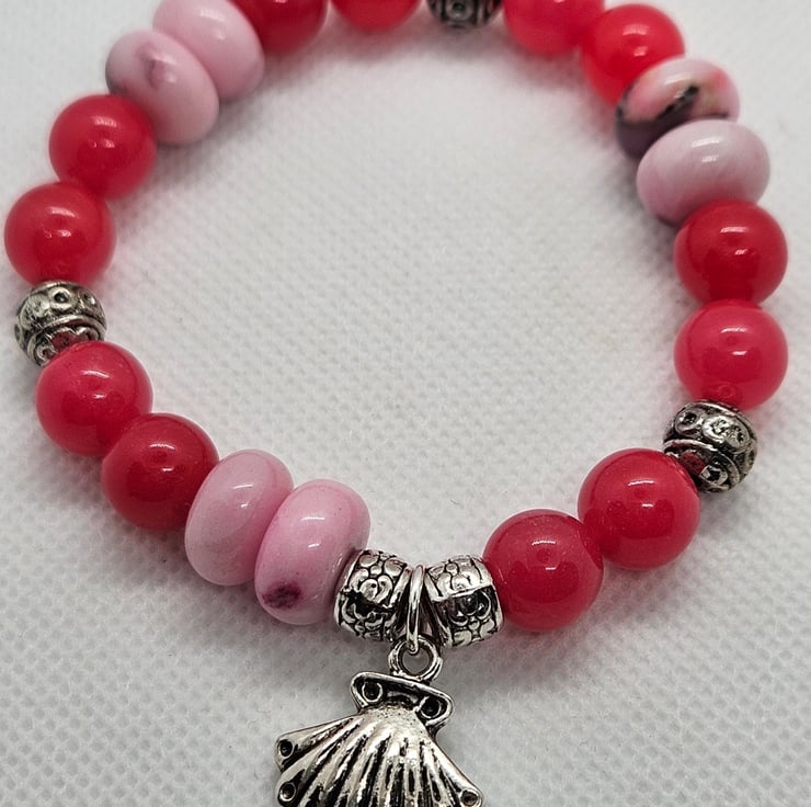 Chunky feel stretchy bracelet made of sweetie pink agate rounds and pale pink jasper with inclusions. Antiqued Tibetan silver beads compliment the pinks with a scallop shell charm. Before stretching this bracelet measures 6.5".