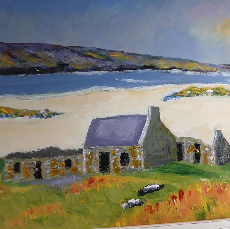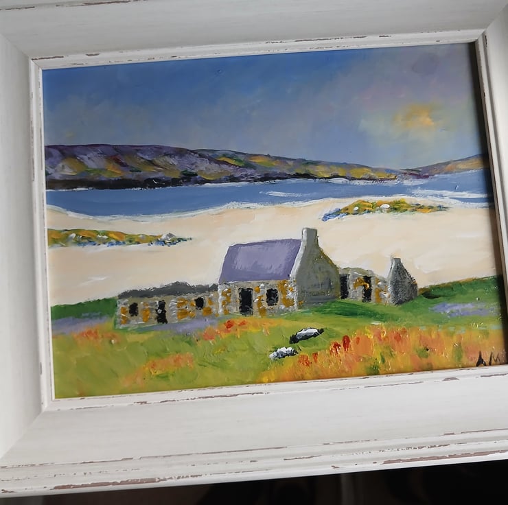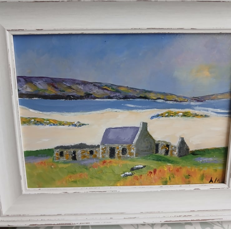 Colourful acrylic painting with gloss varnish overlooking the beach 8 inch x 6 inch plus the frame.