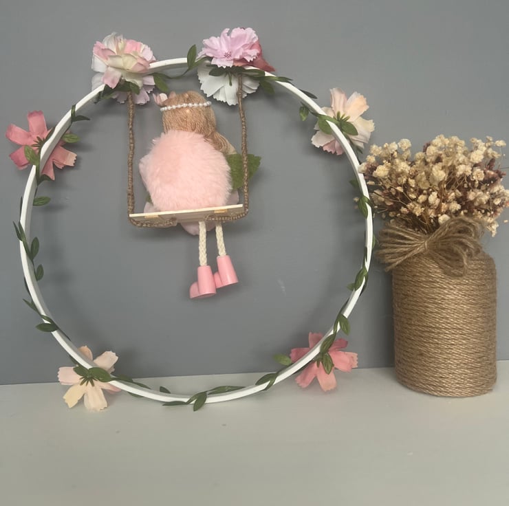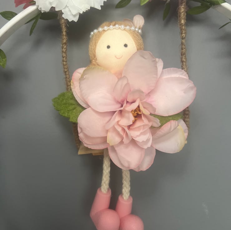 This charming piece features Lily the Blossom Fairy sitting on a rustic swing, surrounded by soft pink and ivory florals with delicate greenery. The design is finished on a painted matt white wooden hoop, creating a timeless and elegant look.