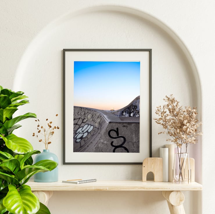 This image offers a different view of the famous lighthouse, seen from the concrete curves and graffiti of the nearby skate park at dusk.
