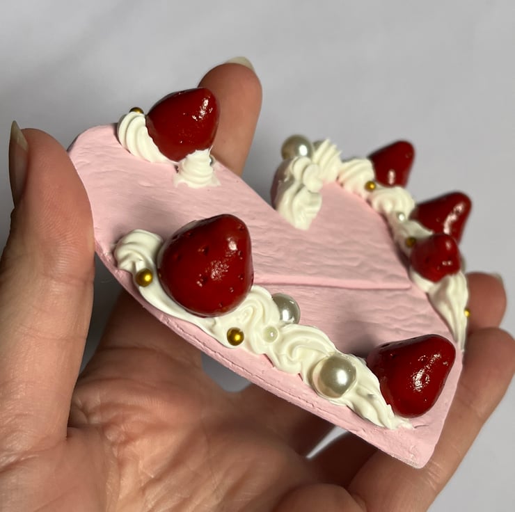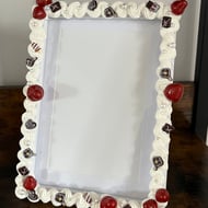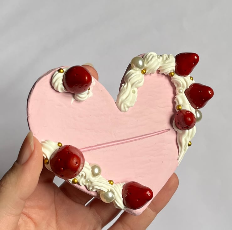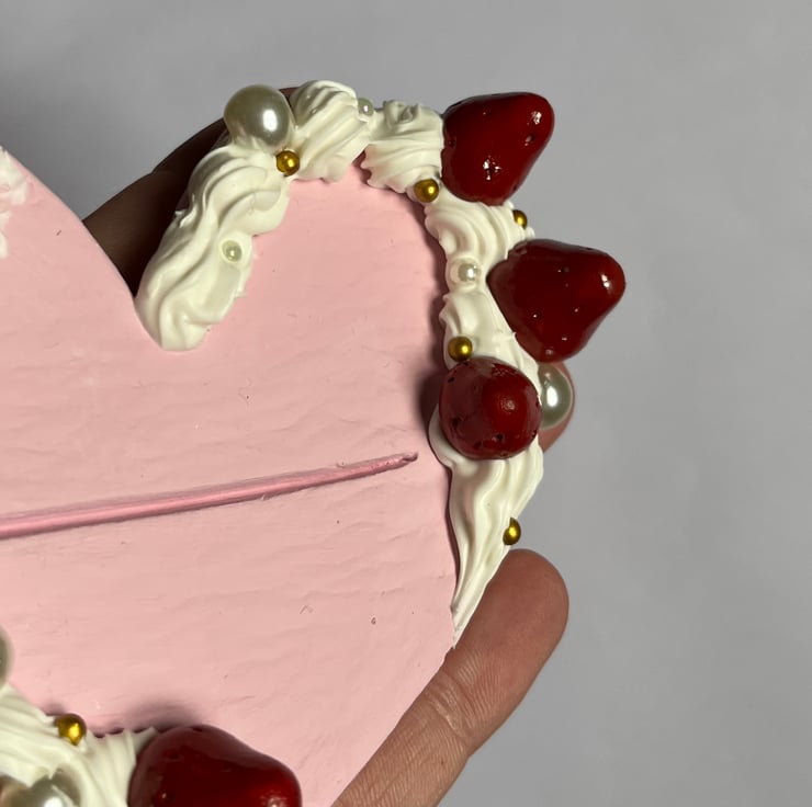 Heart shaped polaroid photo holder. Made from air dry clay, decorated with strawberries and beads.
