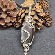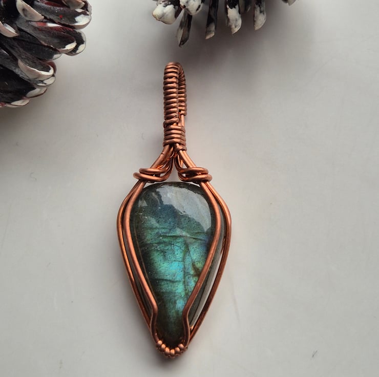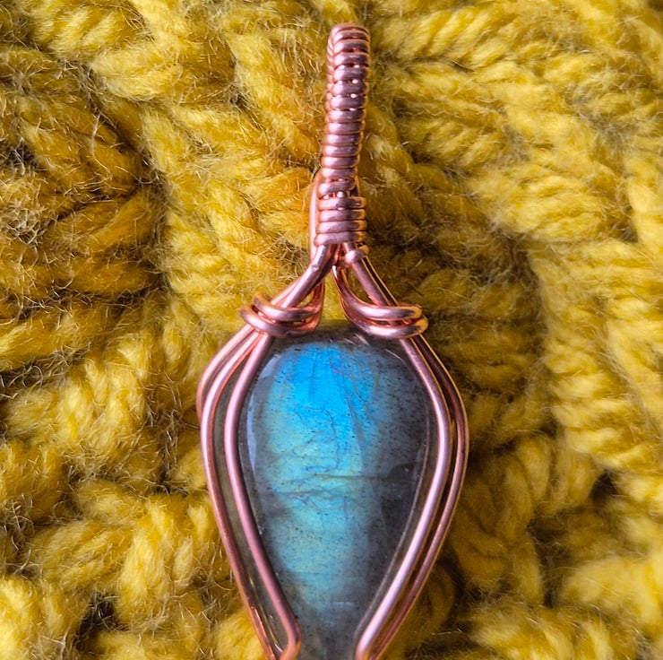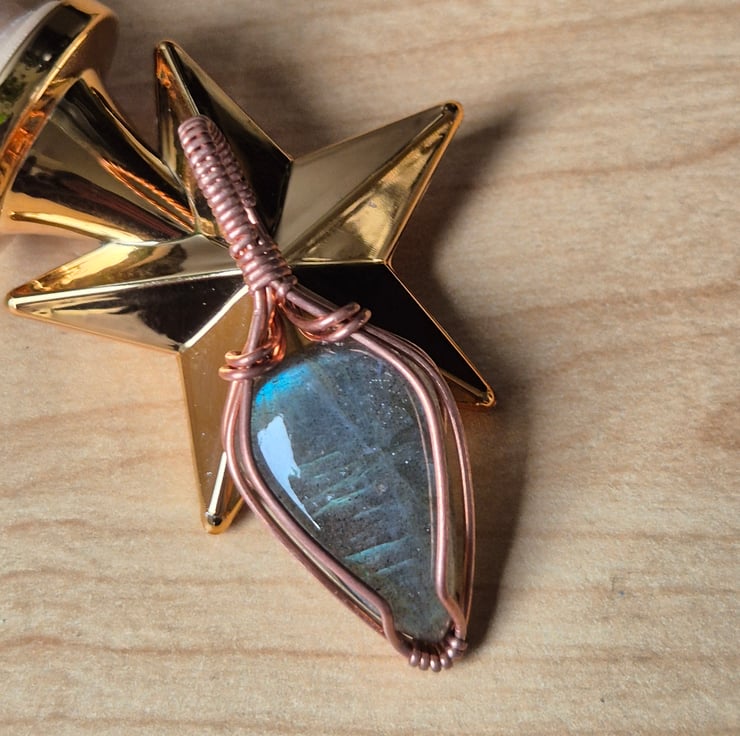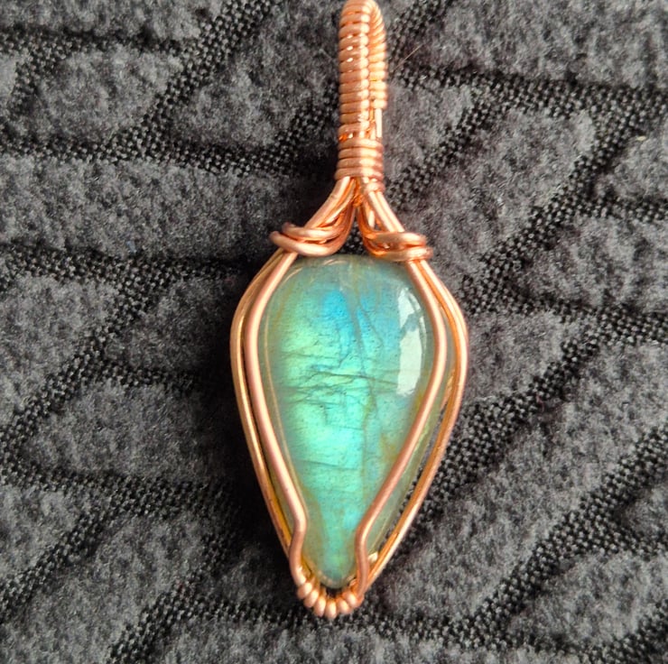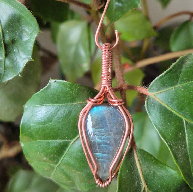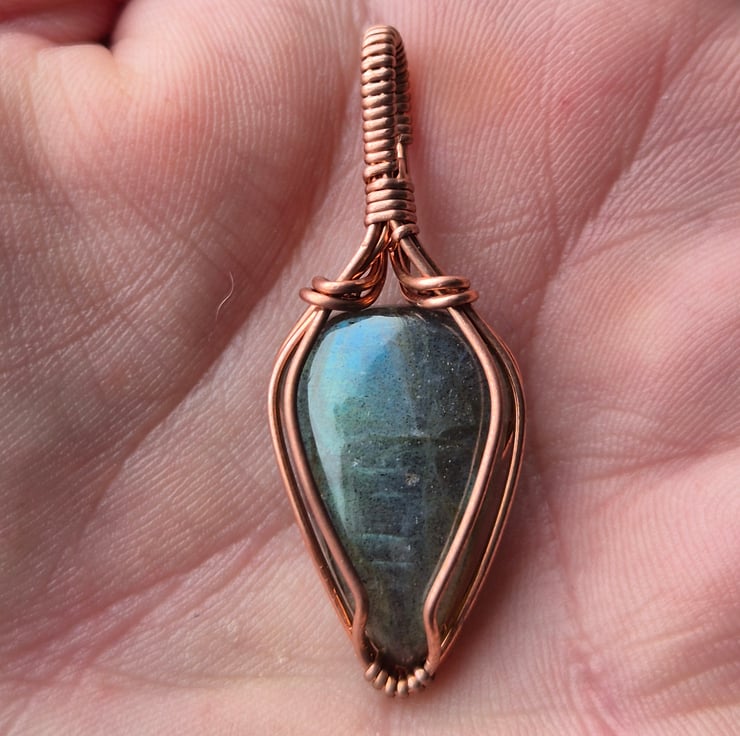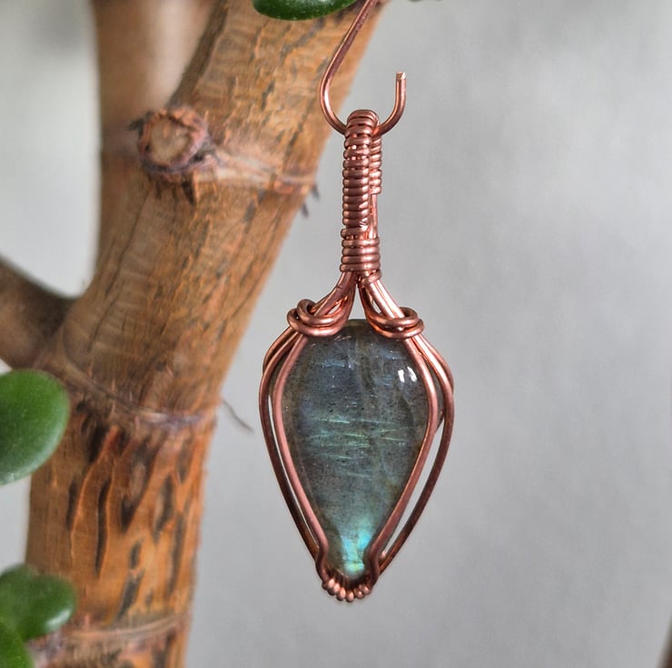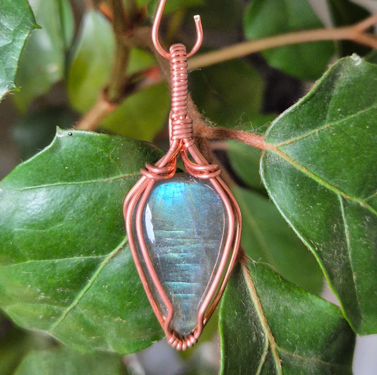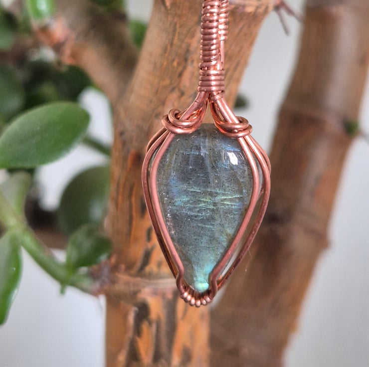 This pendant features a beautiful labradorite with flashes of blue and green, (please look through all the photos, to see the beautiful looks this stone is providing) hand wrapped in copper wire, which enhances the stone beautifully. Each curve of wire has been carefully shaped by hand to cradle the stone securely while still showing off its beauty.