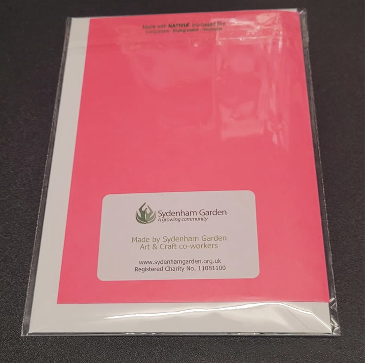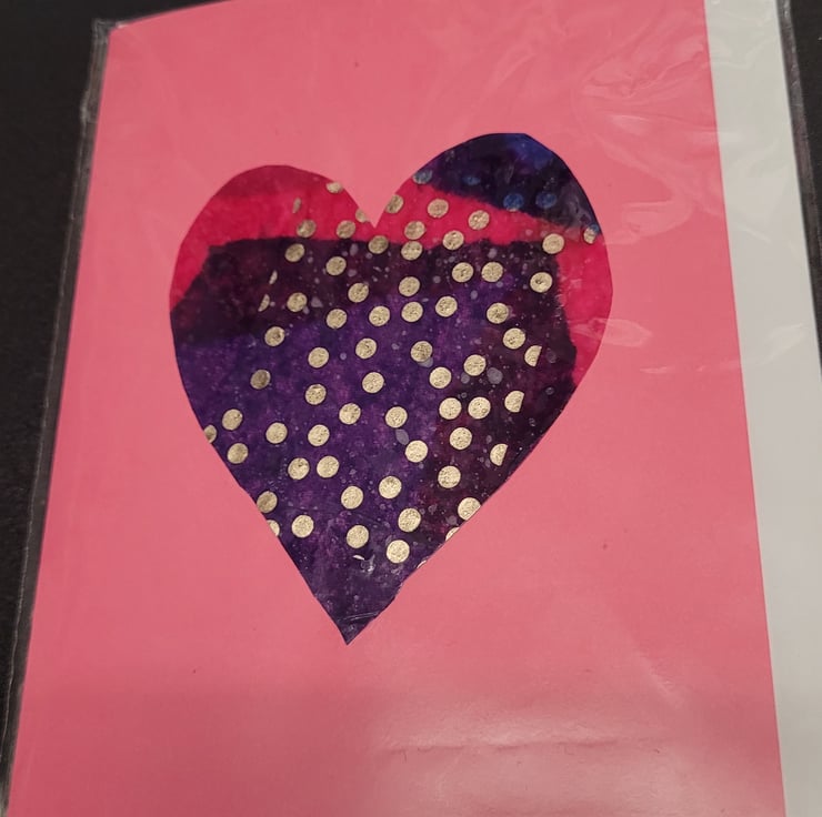 Valentines day blank card A2 folded size 5.5 x 4 with a white envelope packaged in Nativia bio-based film. Handmade by myself attending an art & craft group which is labelled on the back of the card. Love heart design is made by gluing tissue paper onto a laminated surface and peeling it off creating a glossy design effect.