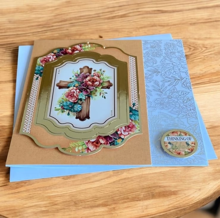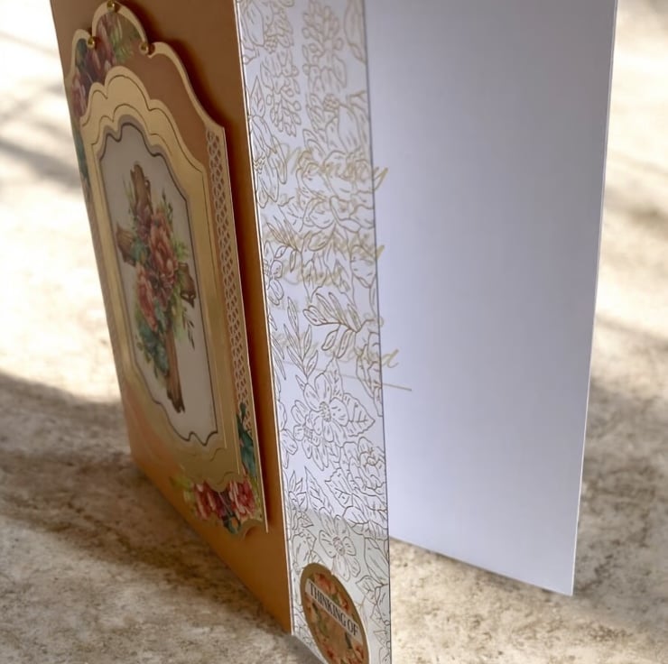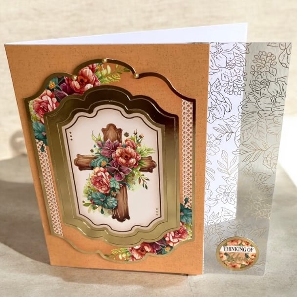 The front features a luxury 3D topper of a wooden-style cross adorned with soft, colourful florals, framed with rich gold detailing. The layered design includes a white linen base, warm orange cardstock, and a gold foiled floral acetate panel that catches the light beautifully.