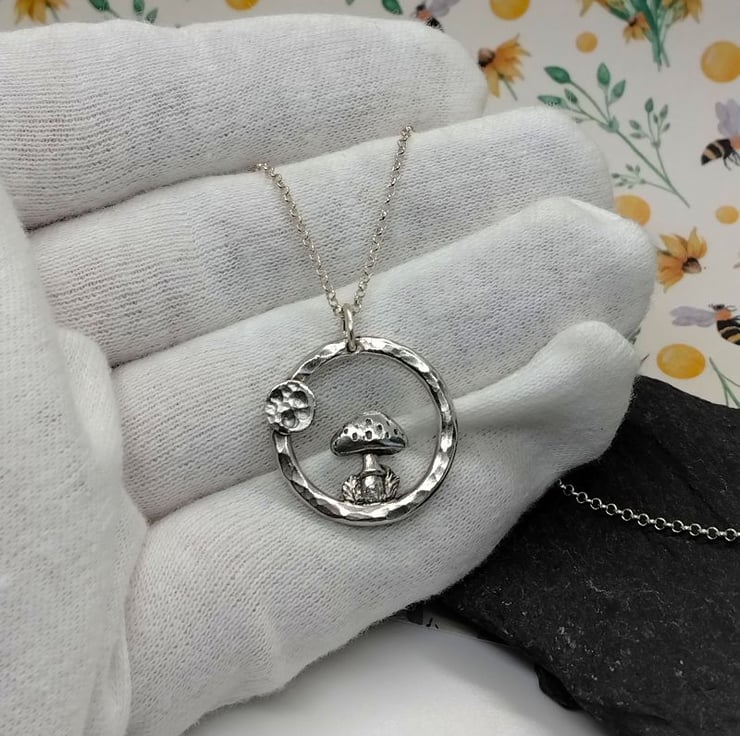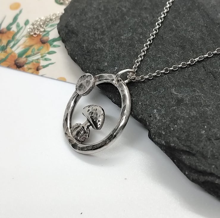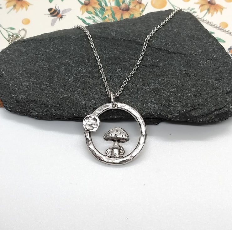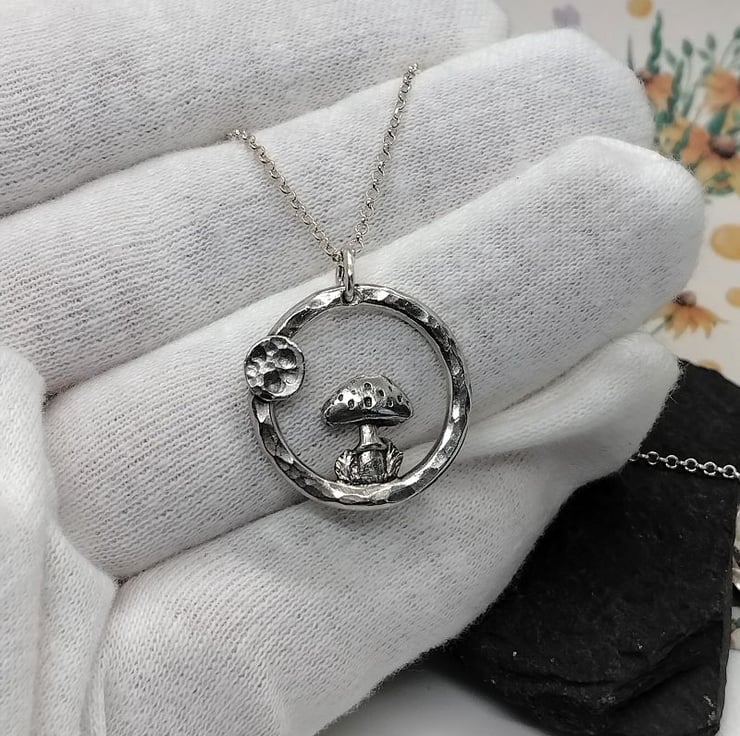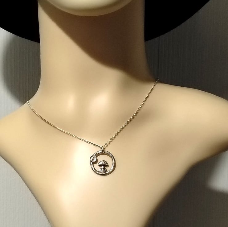 The outer circle has a faceted texture, within the circle sits the detailed mushroom, above a textured full moon, the pendant has been finished with a darkening patina before being sanded and polished back, allowing for the textures and details to stand out.