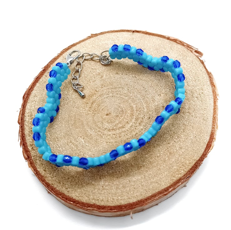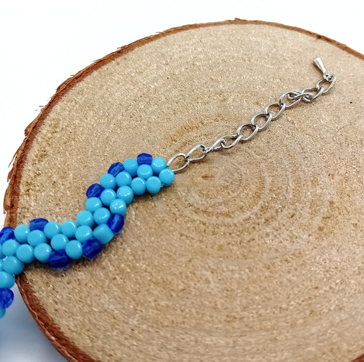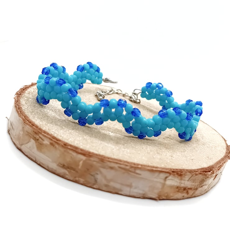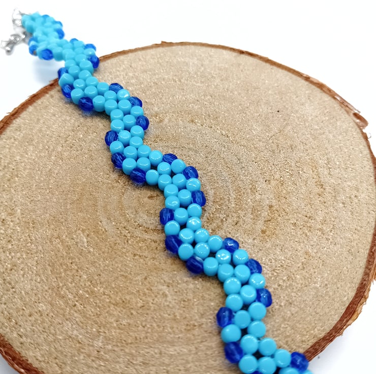 This blue wavy bracelet is handmade with love and intent using UK source materials and various beading techniques learned over years of crafting.