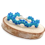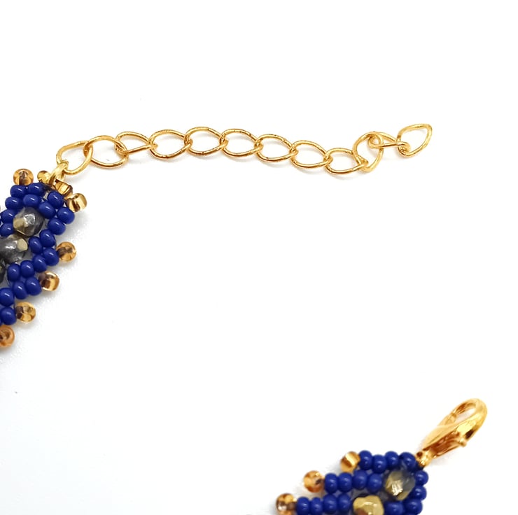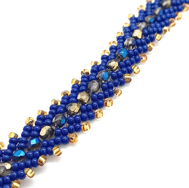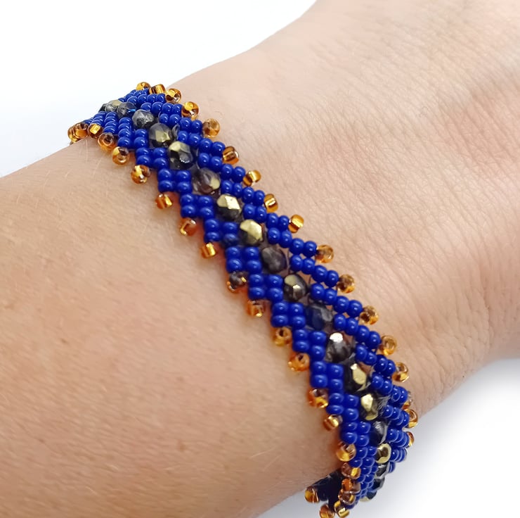 This royal blue and gold St Petersburg weave beaded bracelet has been lovingly stitched and created with high quality rainbow bronze and orange seed beads, gold faceted beads and faux pearl beads.