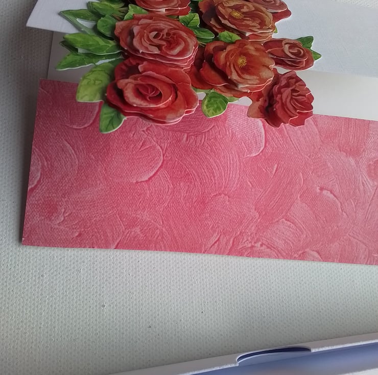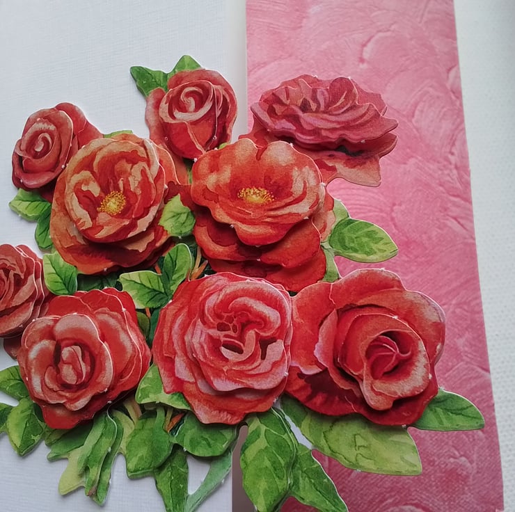 Layered red roses are on one side of this gatefold card, the other side having a red cloudy covering.