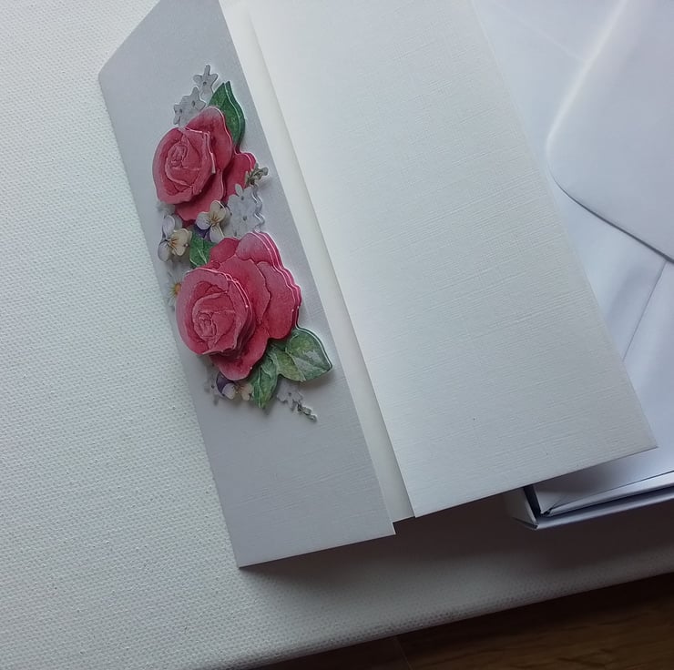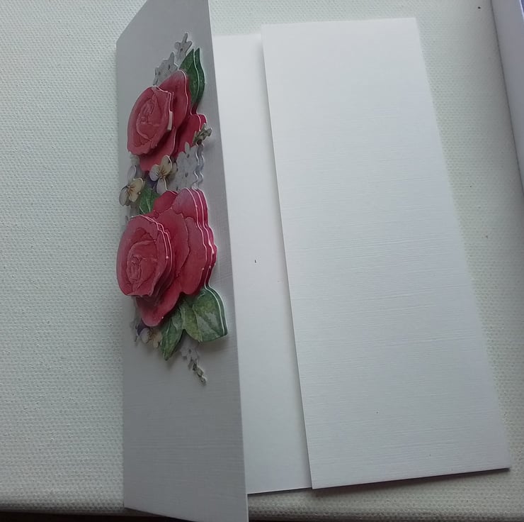 This beautiful card has 3D roses and other flowers on one side of this gatefold card. The other side being left plain.