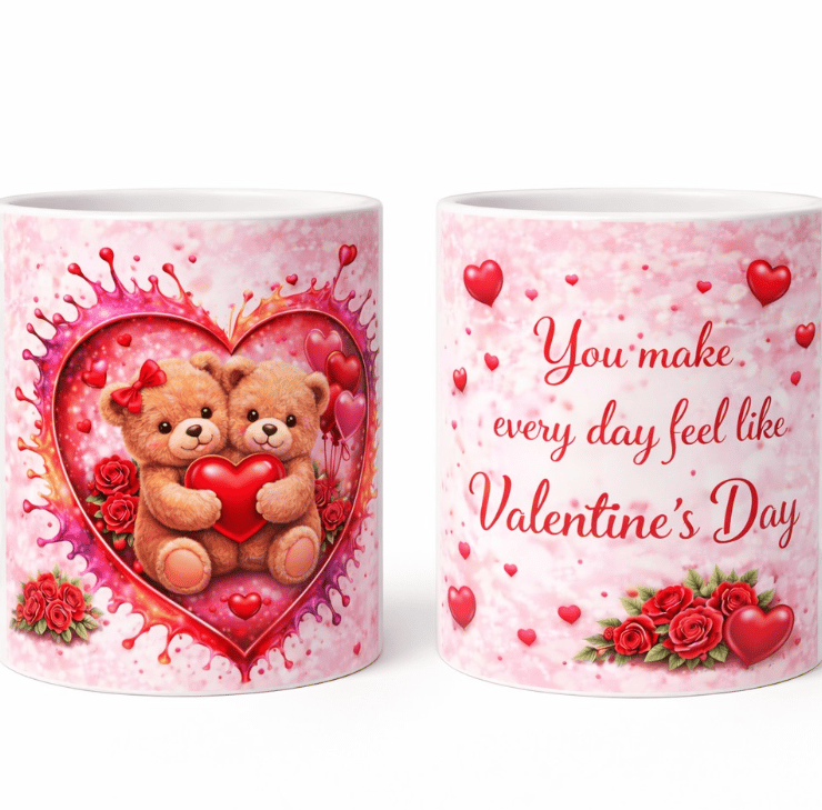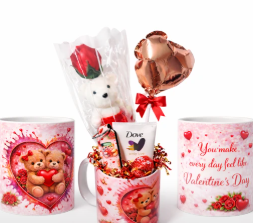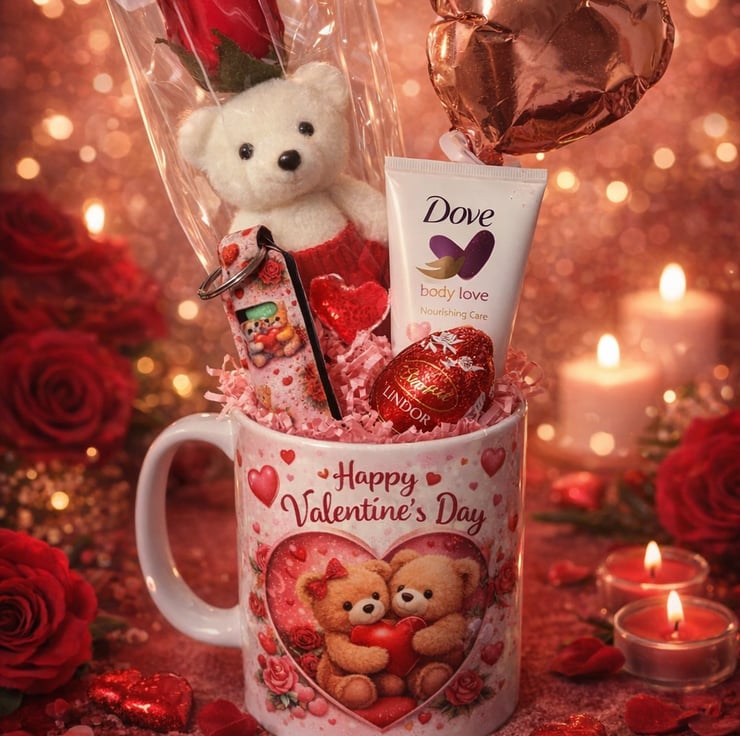 The gift is presented inside a handmade mug and carefully arranged by hand, making each set unique. It’s ideal for Valentine’s Day, anniversaries, or simply as a thoughtful romantic gesture.