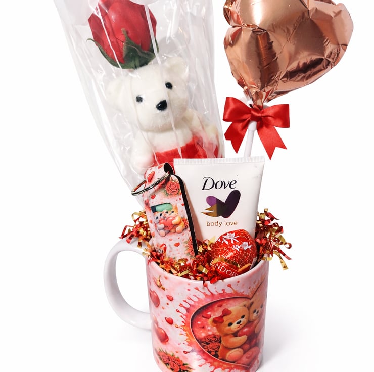 Handmade Valentine’s Gift in a Mug – Teddy Bear, Rose & Pamper Treats