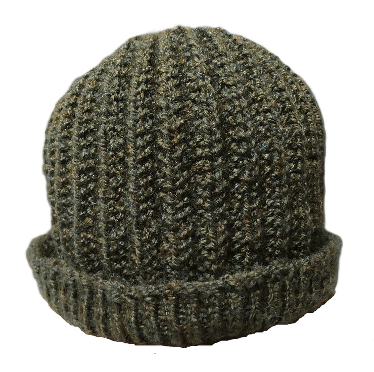Made from moss green acrylic DK yarn with a ribbed style pattern on the hat.