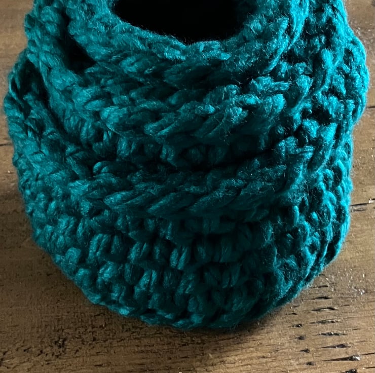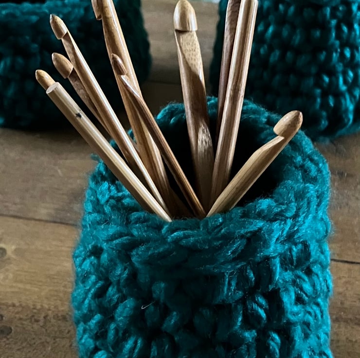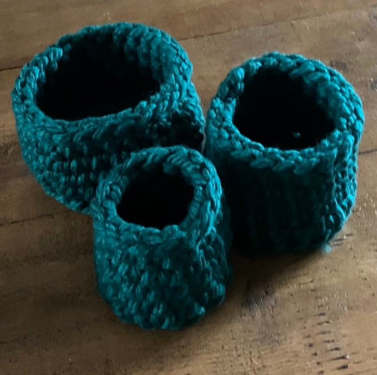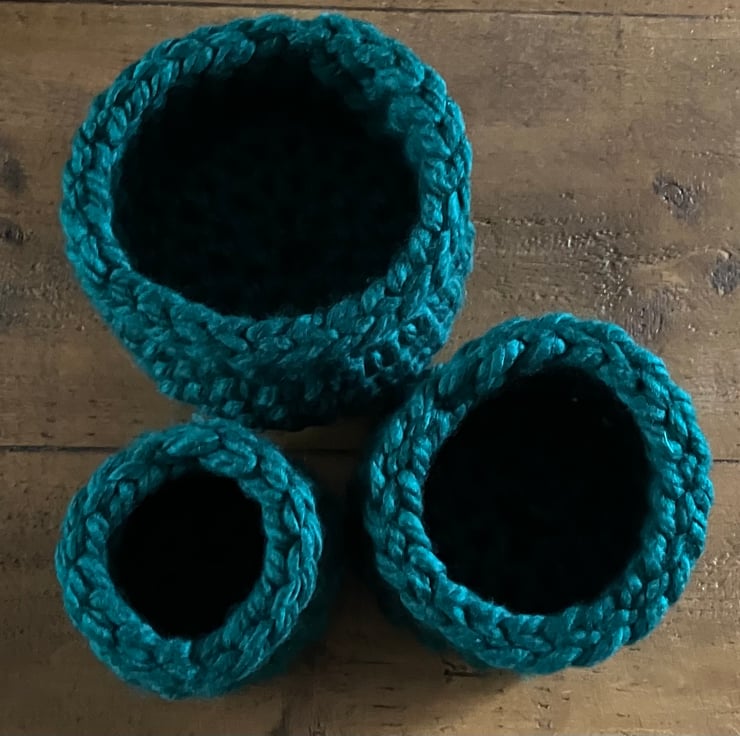 Nest of 3 different sized chunky crocheted baskets in dark green. They all measure approximately 11cm tall. Perfect to keep those small items neat and tidy. They have been crocheted in the round with a chunky wool so that the baskets are quite sturdy.