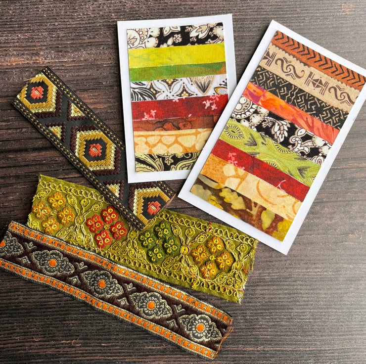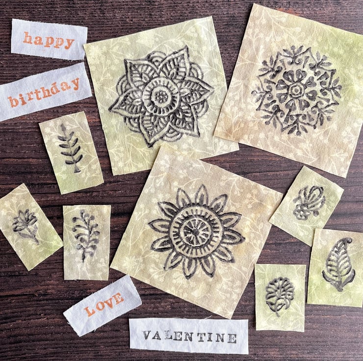I've put together a colourful selection of handmade pieces you can use in your own projects. They could be added to book covers or cards, incorporated in journals or use them as a starting point for bigger pieces. There are three textile collages of boho flowers some of which I've embellished with seed beads and a couple of Suffolk puffs with flowers in the centre. I've included a few pieces of trim, one of which has been tinted with inks to match the colour palette and there's a big a selection of woodblock and ink prints. I've used the fabric scraps to make a couple of small striped collages.