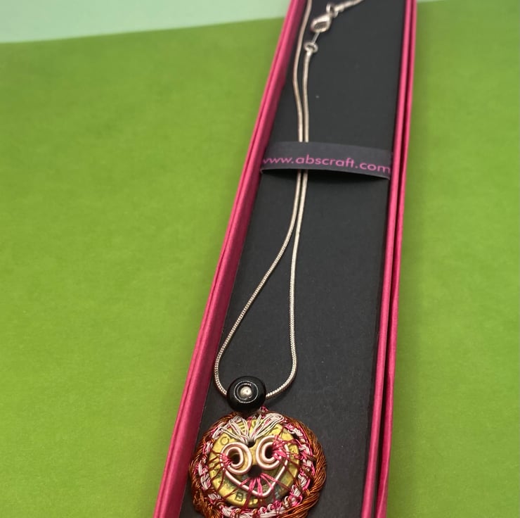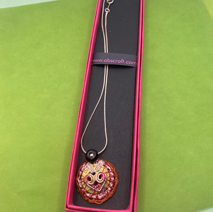 Heart pendant made with vintage metal button, repurposed rose gold plated wire, wire reclaimed from televisions, a vintage button studs and bought wire with silver plated snake chain.