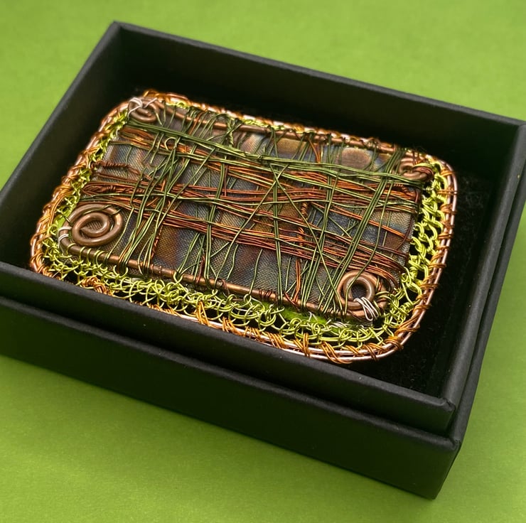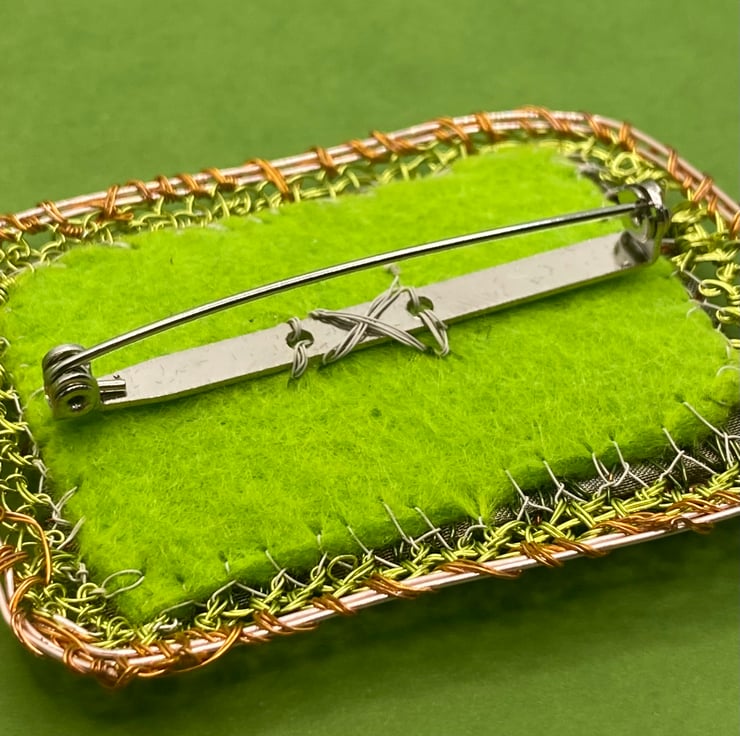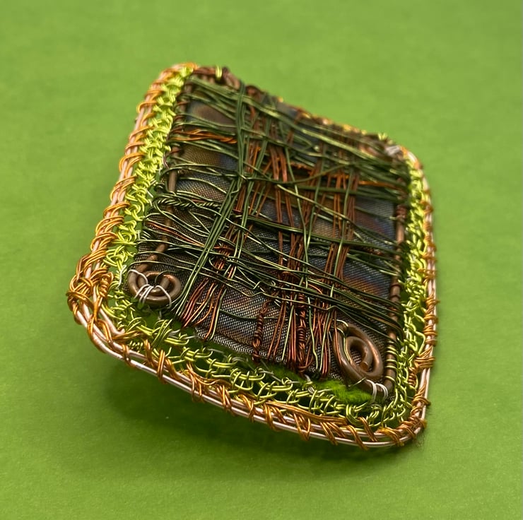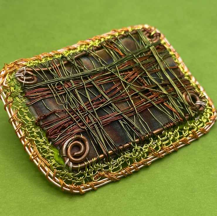 Striation brooch resembling the marks in rocks. wire criss crossed across a layer od mesh bound by two copper bars with curls on each end and surrounded by a filigree edge. Colours included are greens, browns, copper and golds and all back with an acid green felt.