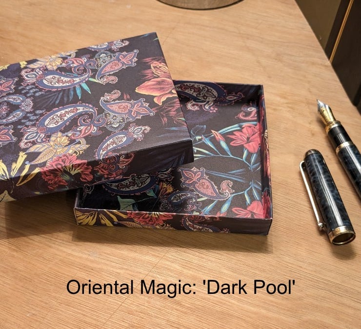 A pair of ultra-thin, handmade gift boxes with separate lids featuring beautiful decorative papers with an oriental theme. This set features 'Dark Pool' and 'Purple Swirl'.