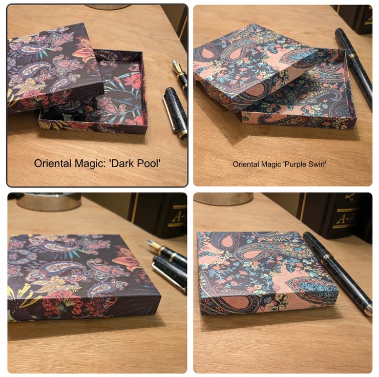 A pair of ultra-thin, handmade gift boxes with separate lids featuring beautiful decorative papers with an oriental theme. This set features 'Dark Pool' and 'Purple Swirl'.