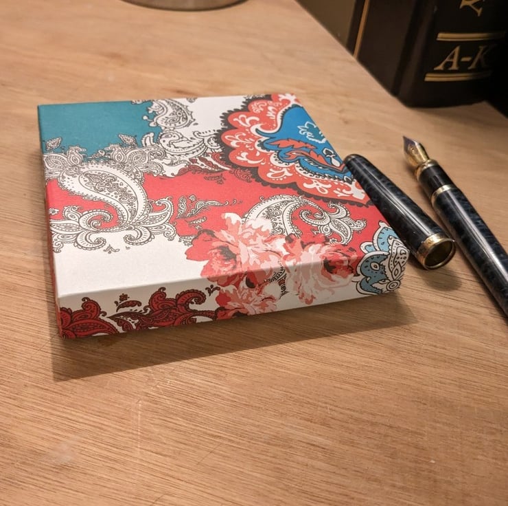 These boxes are complete and ready to use, requiring no further assembly, and the paper completely covers the exterior and interior of both the lid and the base with no cardboard showing. Each box measures 10.6cm square closed. Outside height is 1.7cm and internal box depth is 1.5cm. Ideal for all items not requiring a deep box, such as delicate jewellery pieces, silk scarves, embroidered handkerchiefs, etc.