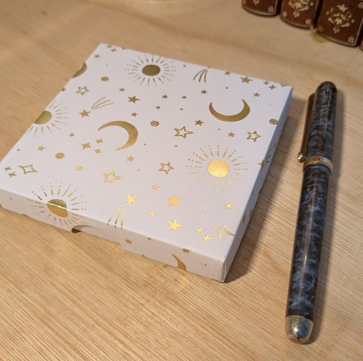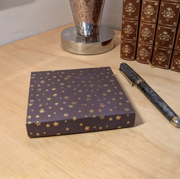 A pair of ultra-thin, handmade gift boxes with separate lids based on the Violet Studios 'Cosmic Dream' series of beautiful decorative papers. This set features 'Blue Stars' and 'White Moons'.