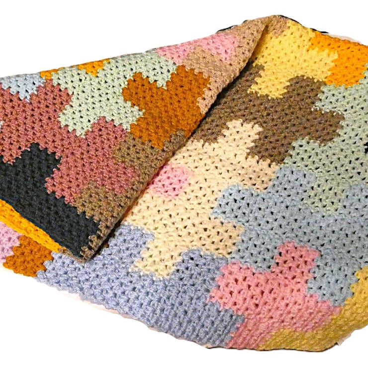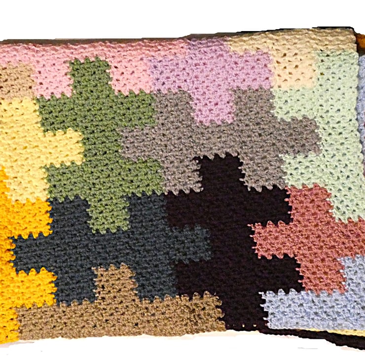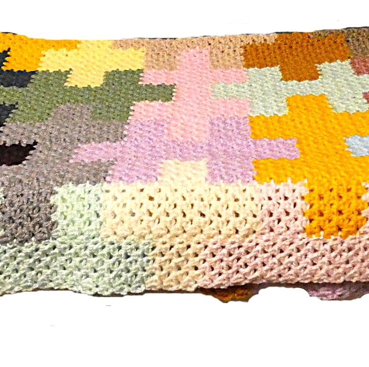 Colourful handmade knitted blanket with jigsaw puzzle shapes. Of my own design to use up left over wool. Ideal for keeping you warm on those long, dark chilly nights.