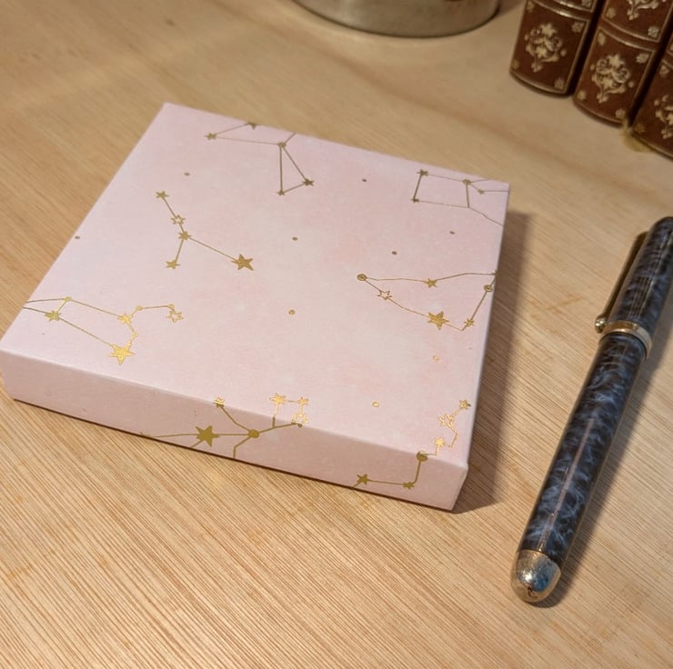 A pair of ultra-thin, handmade gift boxes with separate lids based on the Violet Studios 'Cosmic Dream' series of beautiful decorative papers. This set features 'Blue Moons' and 'Pink Constellations'.