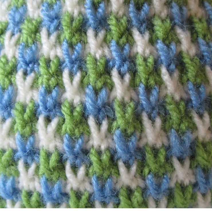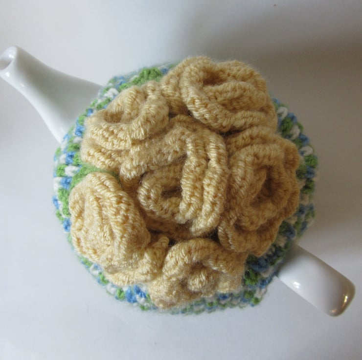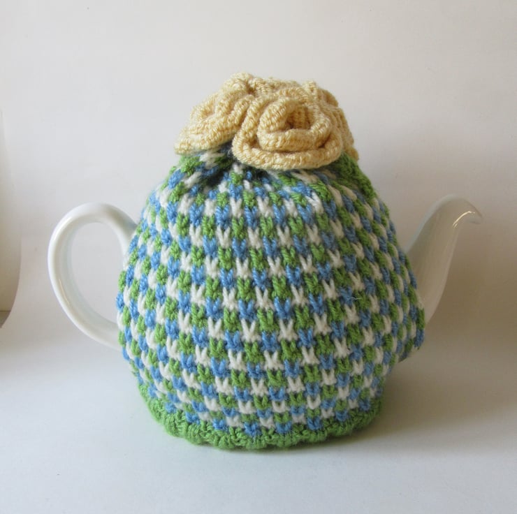 A hand knitted tweed stitch tea pot cosie in bright spring colours, with six knitted roses atop. Starting at the hem I have knitted the rib in a bright apple green coloured yarn. Then using three different coloured yarns; bright blue, cream and apple green, I have knitted a wonderful tweed stitch tea cosie body. There are six contrasting primrose yellow roses and three apple green leaves nestled on the top, giving extra insulation at the top of the pot where most heat escapes from. This stitch ensures a good fit around the pot, yet has enough ease for a swift removal when a 'top - up' is required. The tea pot handle peeps through the side opening so it dosnt get too hot to handle. A perfect house warming gift, or for yourself...... just because it looks pretty on the kitchen work top.