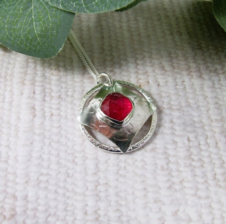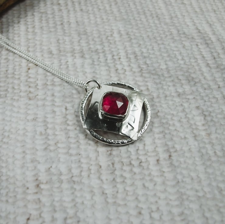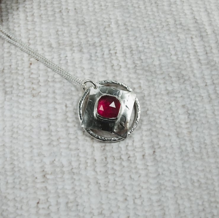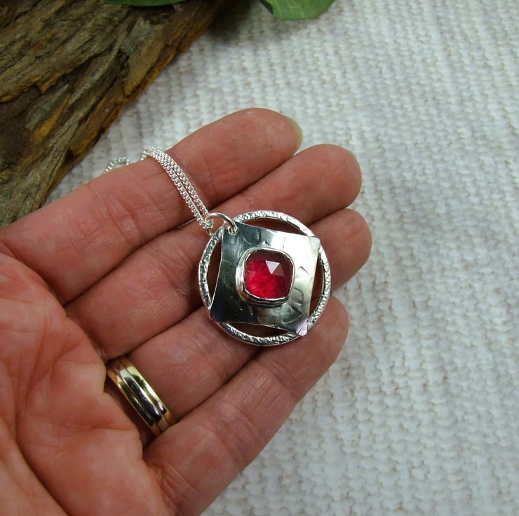 I have designed the pendant using recycled silver creating a circle from 2mm silver wire for the base then added a hand cut square, shaped and curved in on the sides. I have added texture to the this with a geometric pattern then added a setting for the red quartz.