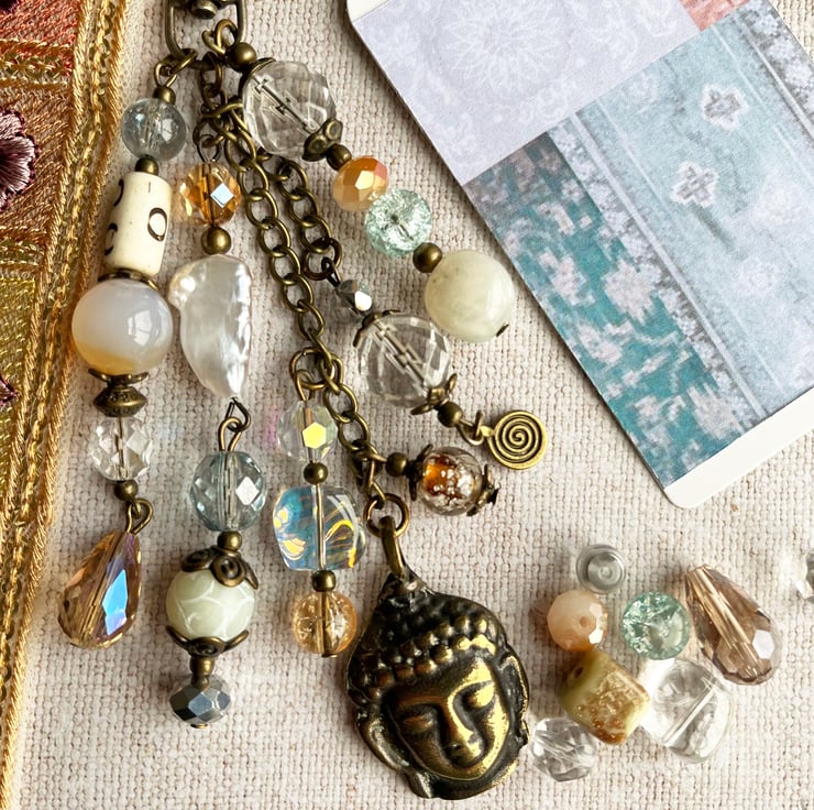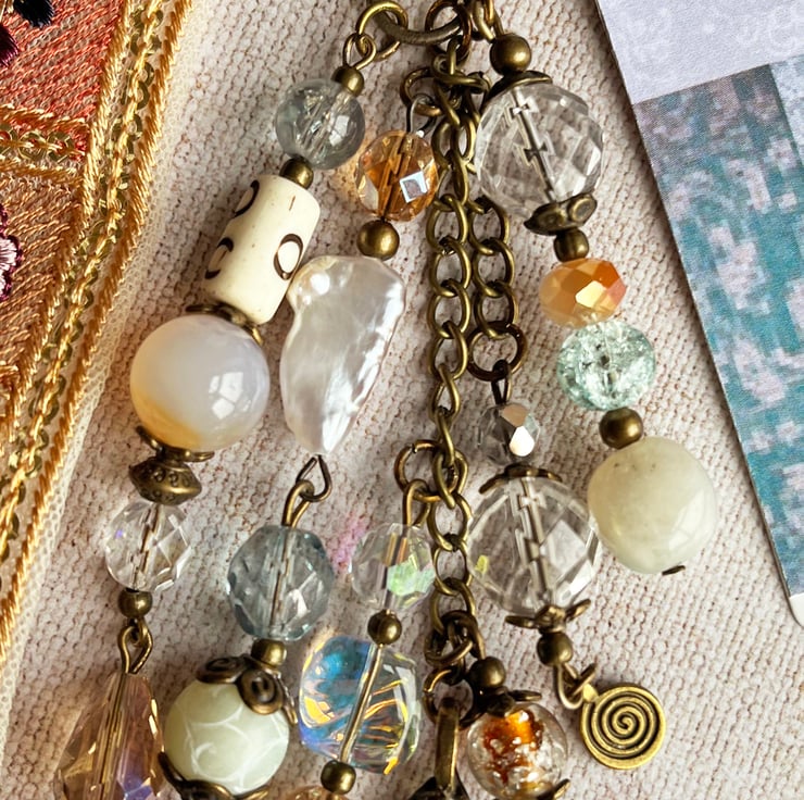 This handmade bag charm with its cascade of pretty beads would add an opulent boho vibe to any bag. I've used sparkling silvery-white beads, some with a hint of pale blue and pink. It is perfect for anyone with an April birthday as I've included a couple of large faceted Rock Crystal beads which is the birthstone for April.