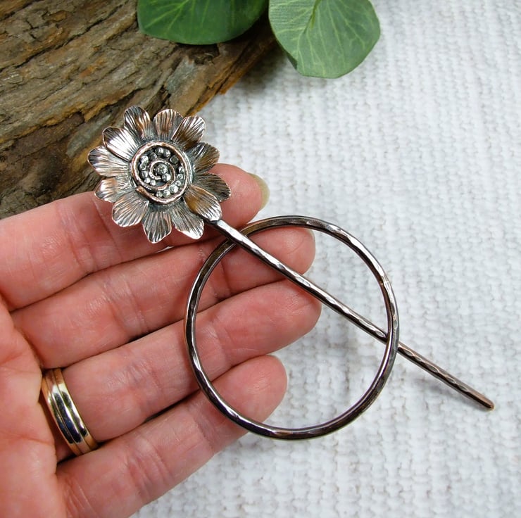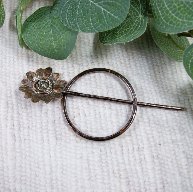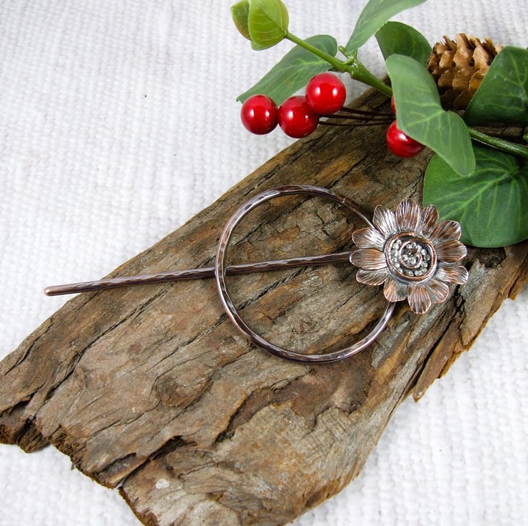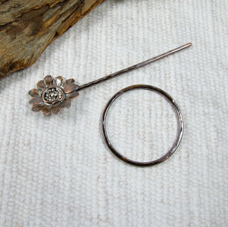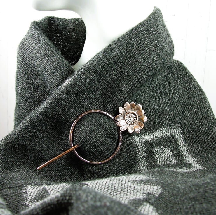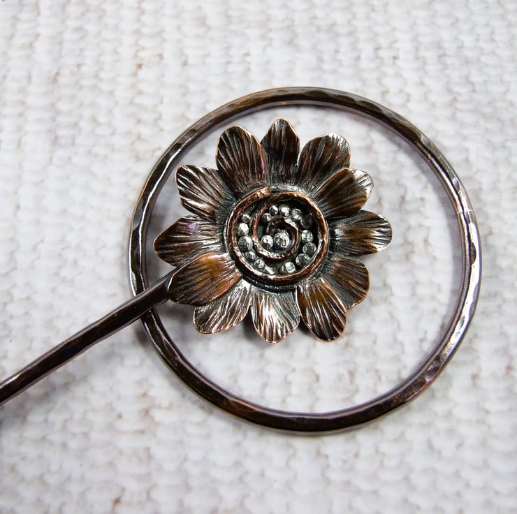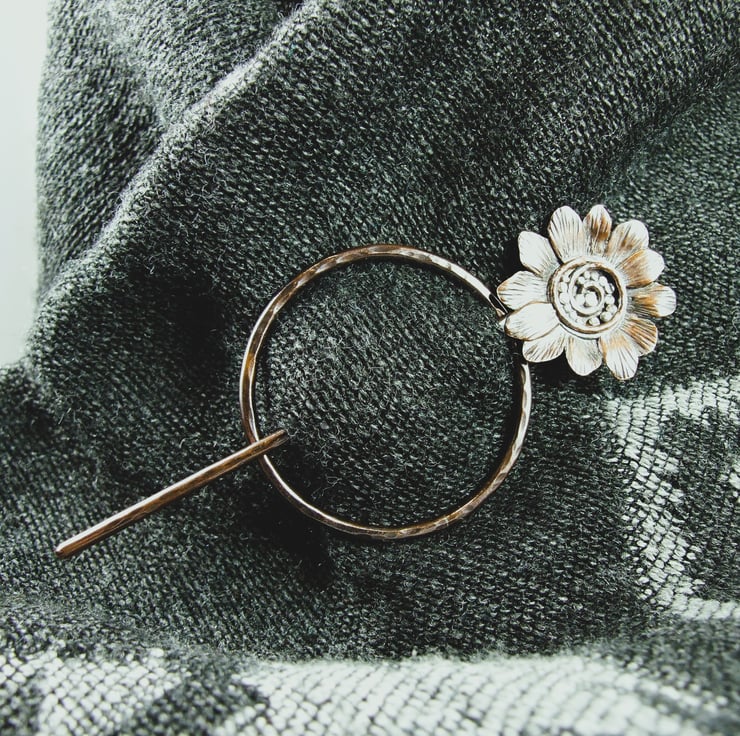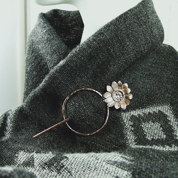 The circle shape is hand forged from 2.5mm solid copper wire with hammered texture. The pin is also made from 2.5mm wire, shaped with a rounded blunt point and a flower at the top. I created the flower with copper sheet hand drawing the flower shape and cutting then adding texture and petals. The flower centre is made up using copper and silver wire and silver and copper beads all soldered in place.