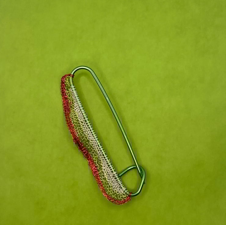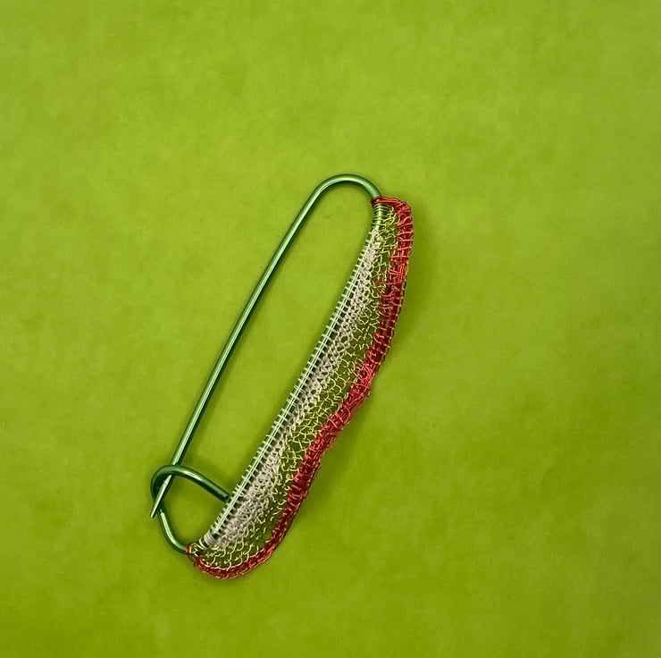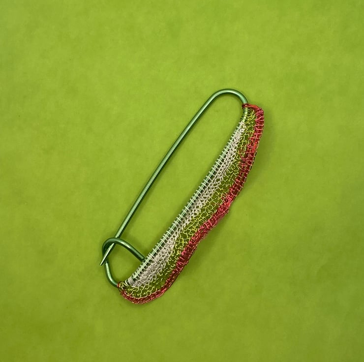 Kilt pin in white acid yellow, pink and red. I created kilt pins after my many stays back in Edinburgh last year (and this). They can be worn as scarf pins as well as in a loose weave sweater or kilt. I have used bought wire combined with wire I have recycled from electrical appliances and added to a green aluminium stitch holder as a pin. Ready to gift in a green box with removable pink branding.