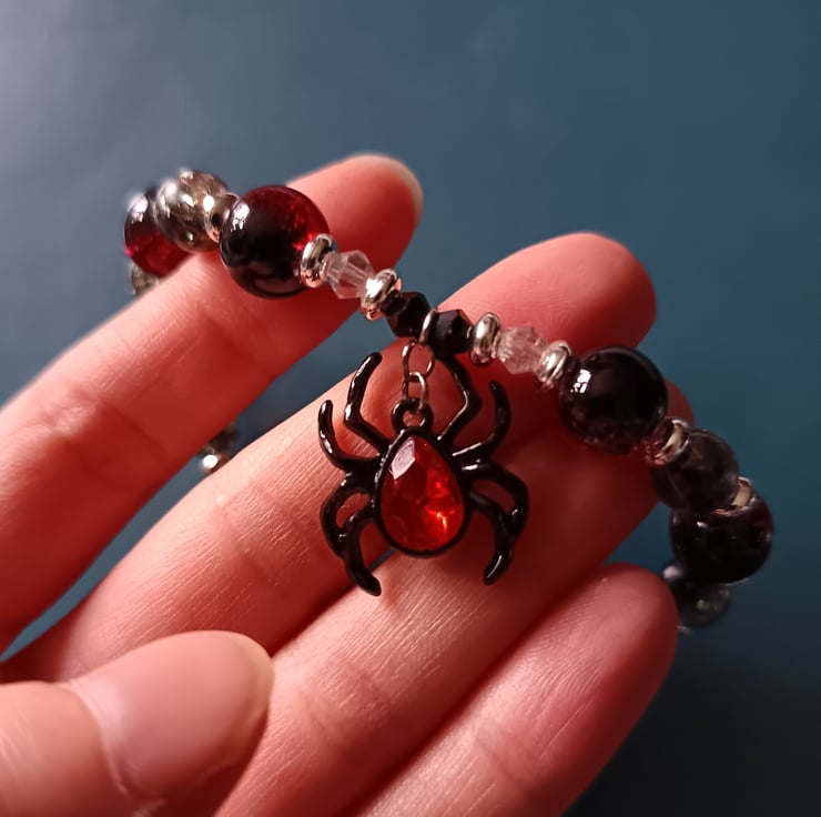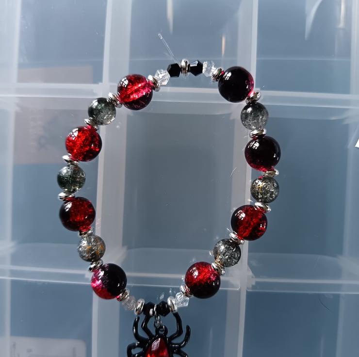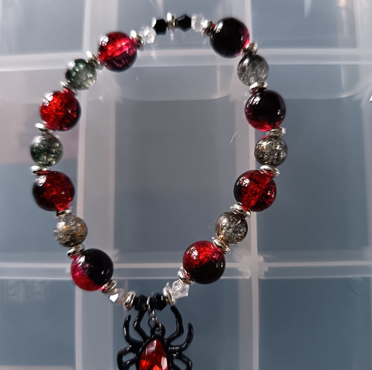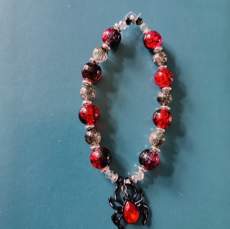 This handmade bracelet is crafted with magic stretch elastic, a black and red spider charm, silver decorative spacers, red, black and clear glass beads. Measuring approximately 7 inches, this piece also has a matching earring set available.