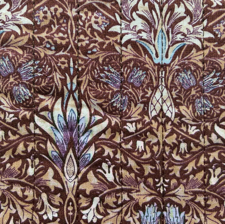 The sleeve is quilted with brown thread and is fully lined with plain chocolate brown fabric.