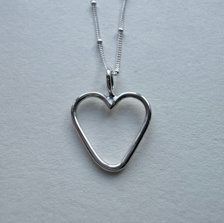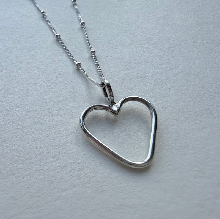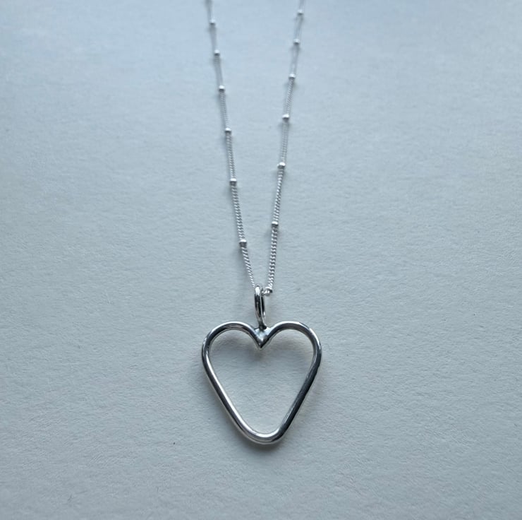A handmade silver heart finished with a high shine and hung on a 20 inch sterling silver satellite chain