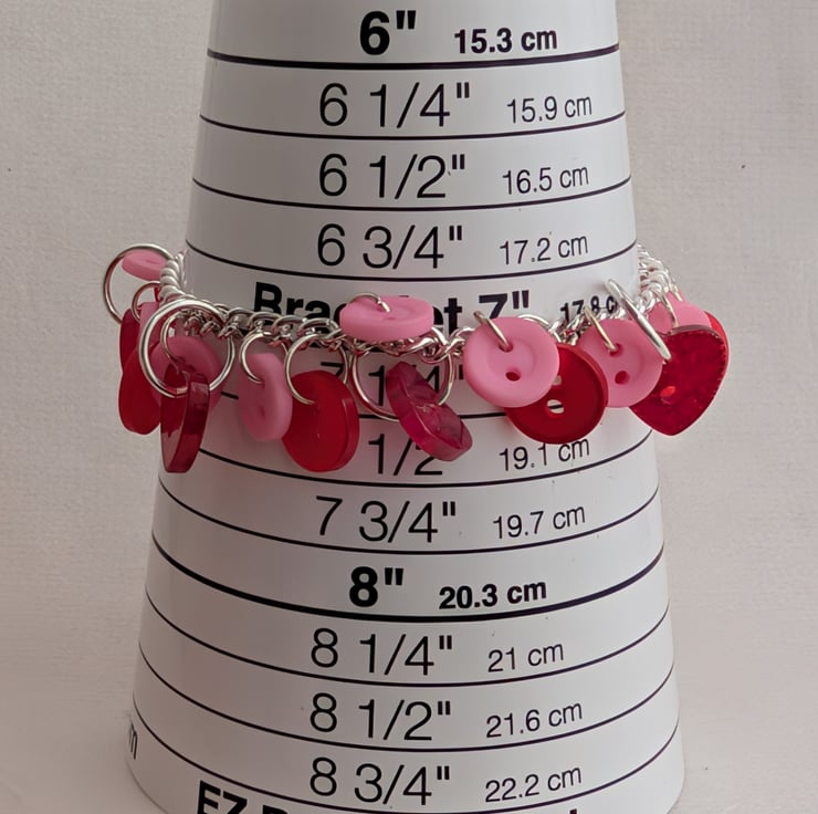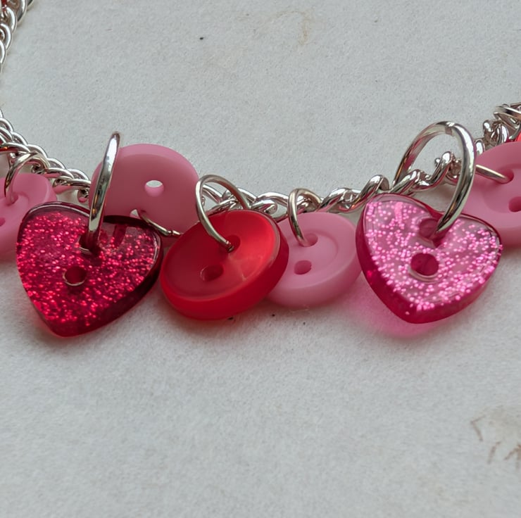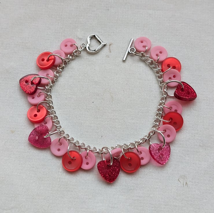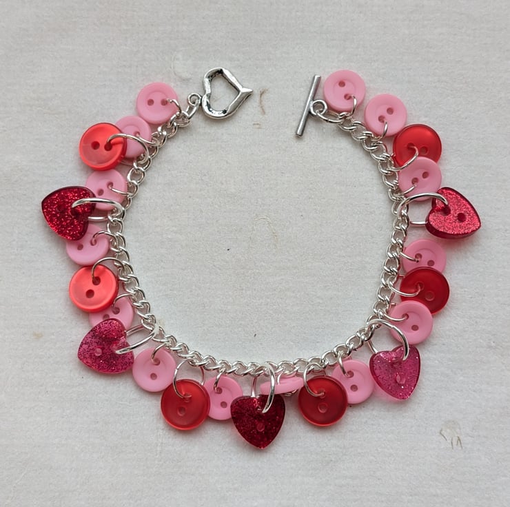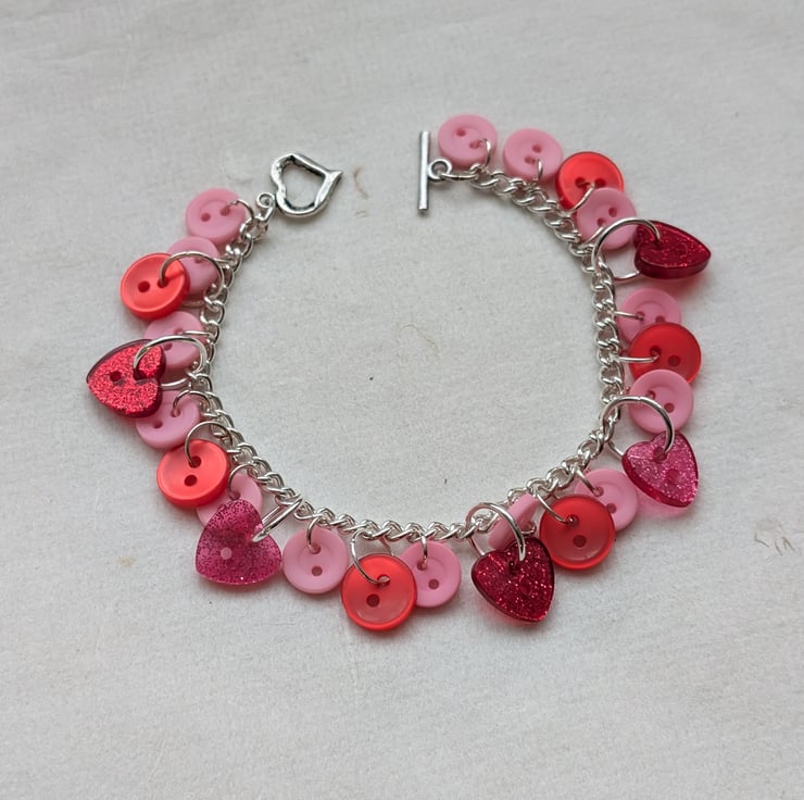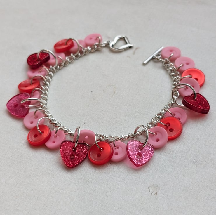 This pretty bracelet features a silver plated chain decorated with a mix of pink and red buttons. Most of the buttons are round but there are a few glittery hearts sprinkled amongst them. The heart-shaped toggle clasp carries on the theme.