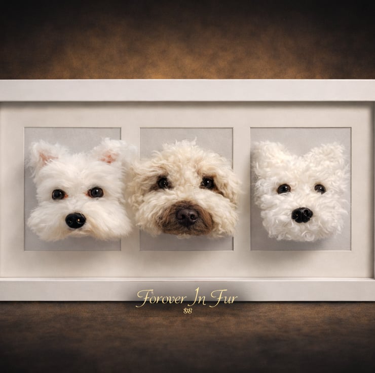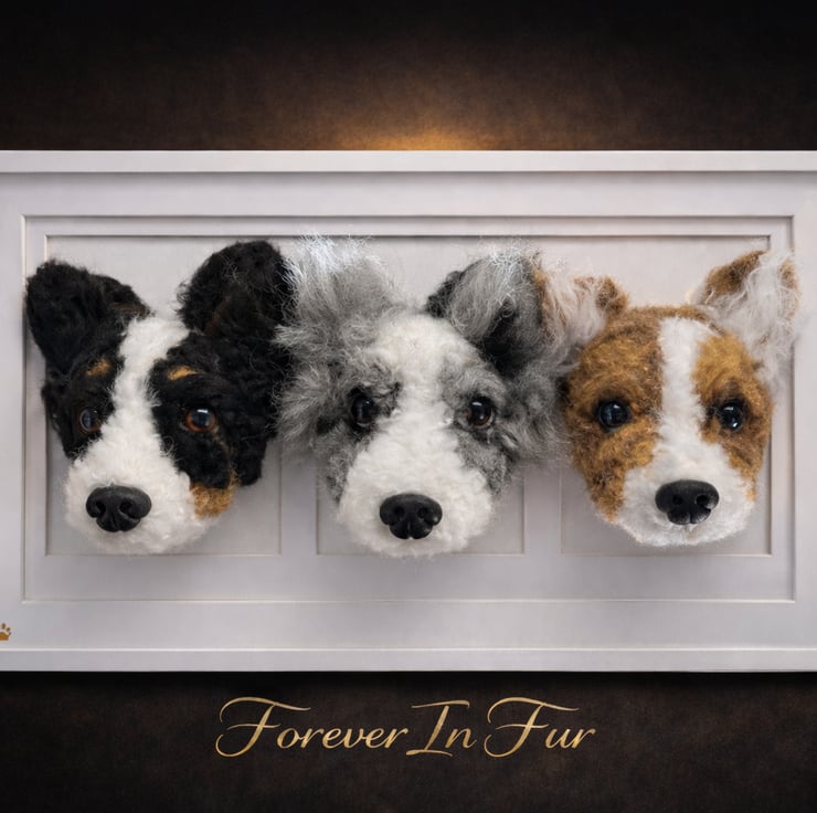 Each portrait is carefully handcrafted using traditional needle felting techniques to create a miniature sculpture inspired by your pet. The finished replica is mounted inside a frame to create a unique three-dimensional portrait that captures the character and markings of your dog.