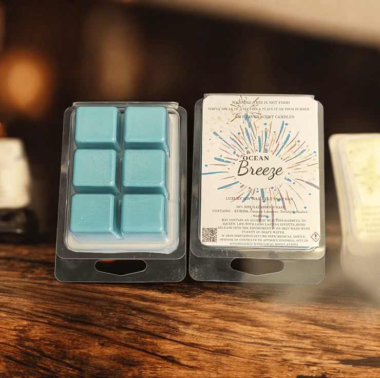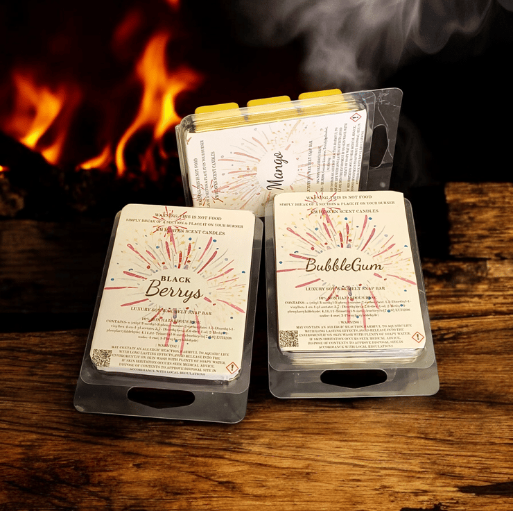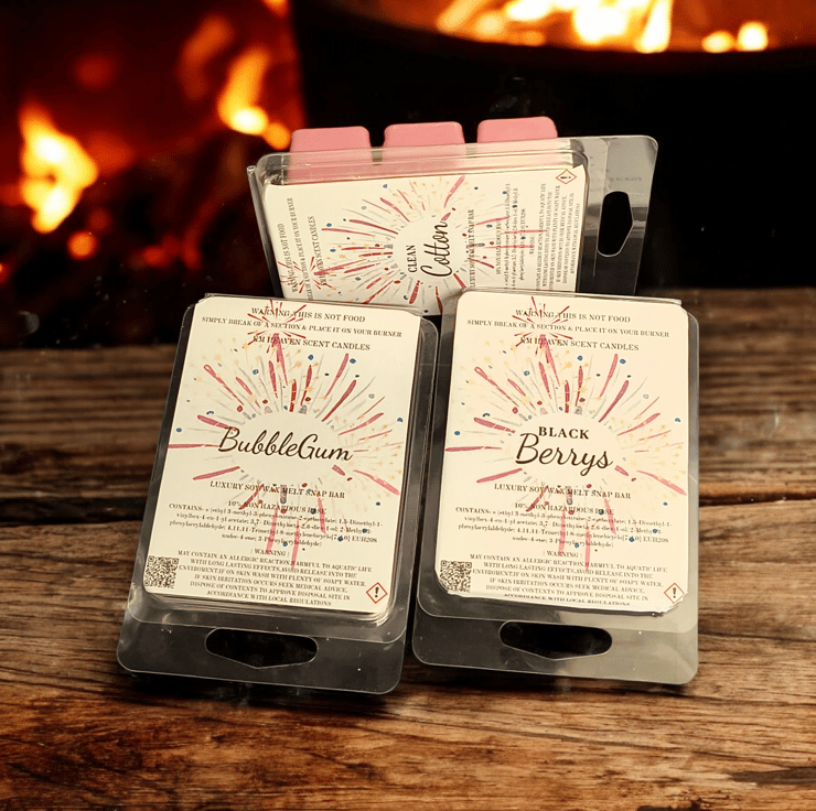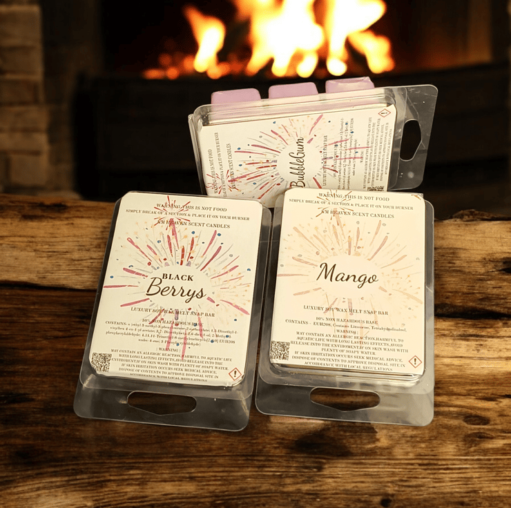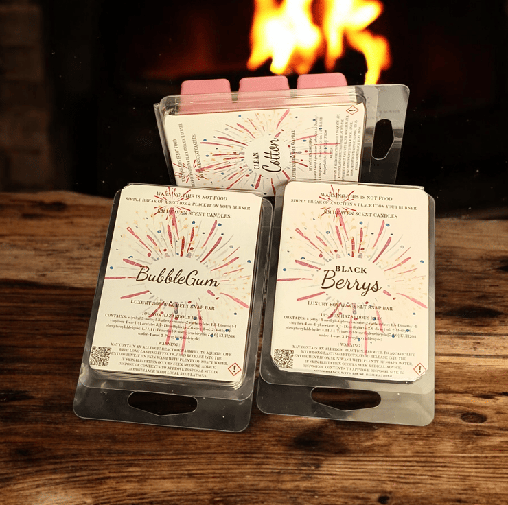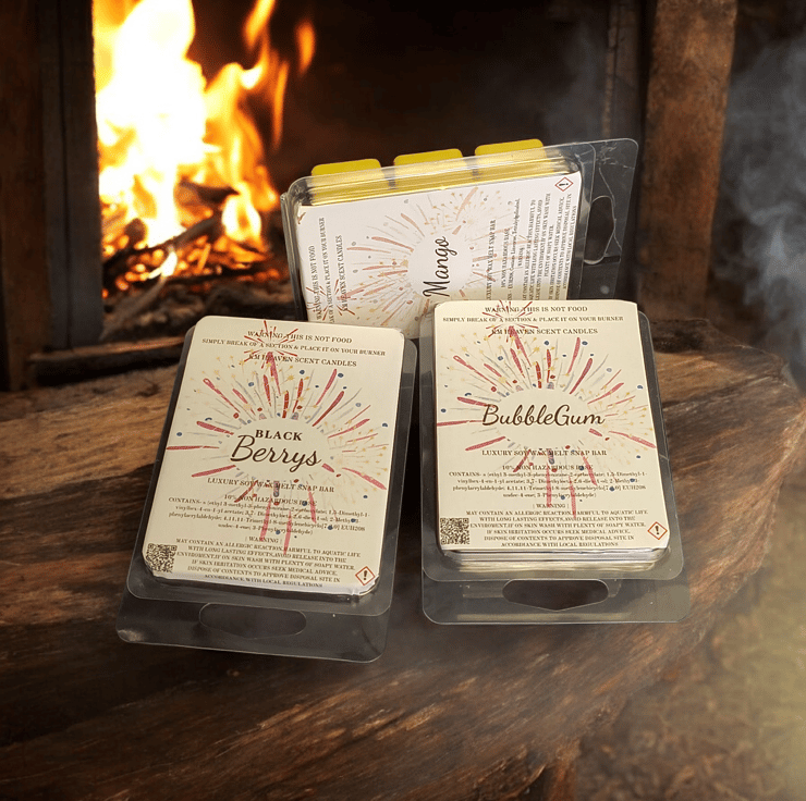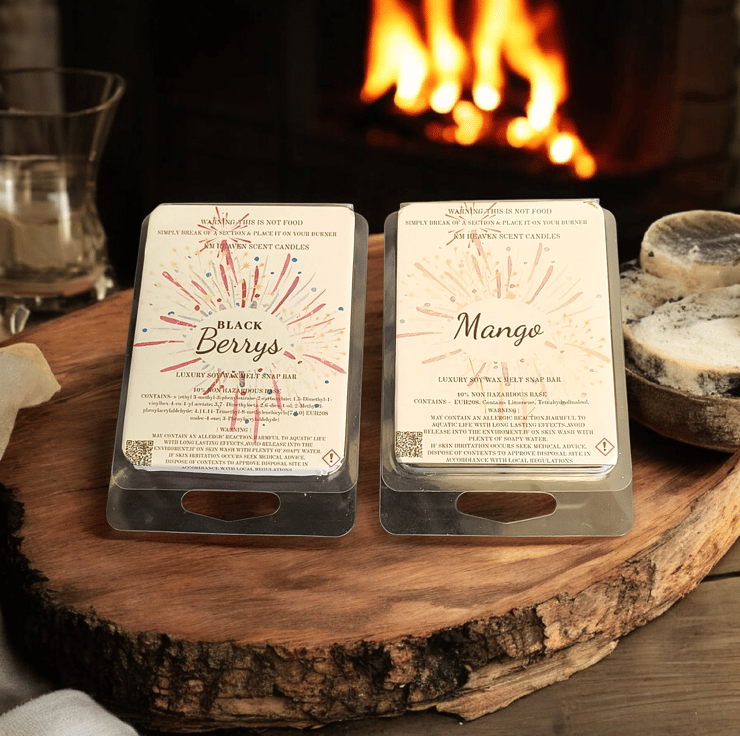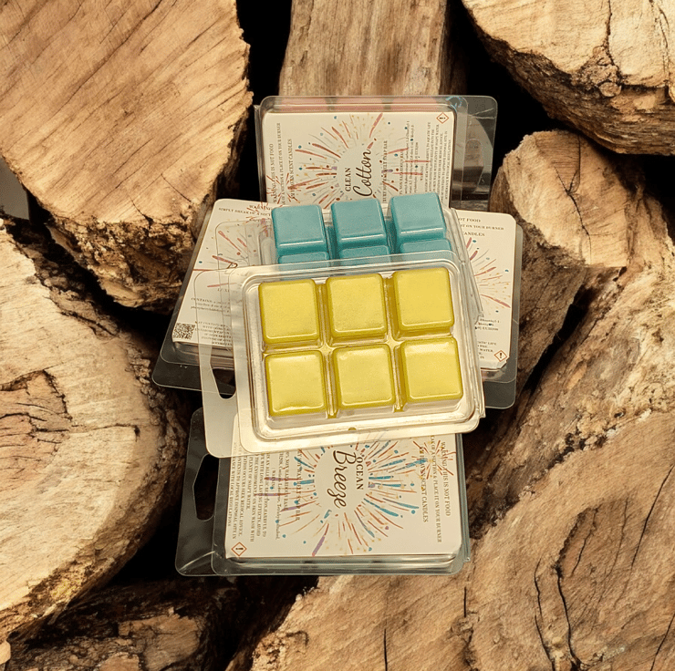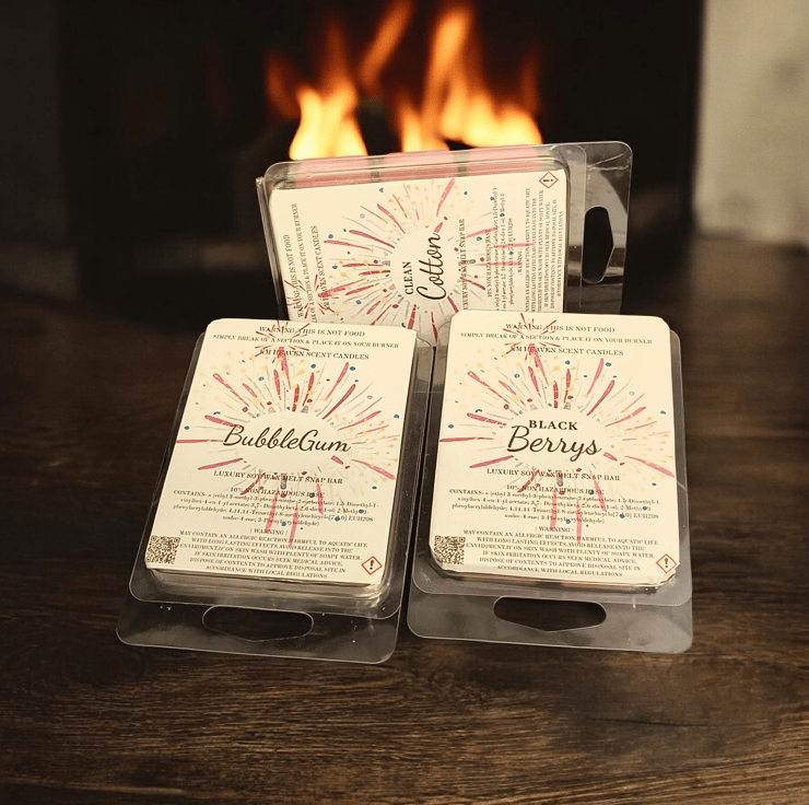 Indulge in our handmade, highly scented soy wax melts, packaged in eco-friendly 6-cell clamshells. Enjoy a long-lasting, powerful fragrance throw that transforms your space, perfect for cozying up your home.