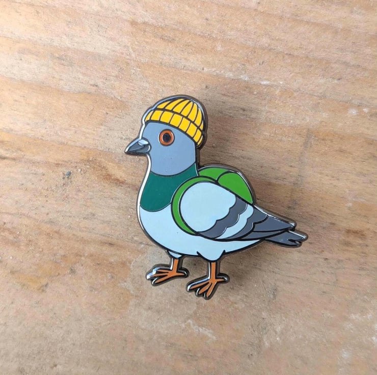 Meet your new feathered friend! This pigeon enamel pin features a cheerful city bird wrapped up for adventure, complete with a cosy beanie and a tiny backpack. It’s a fun little piece for anyone who loves pigeons, quirky wildlife, or characterful accessories.
