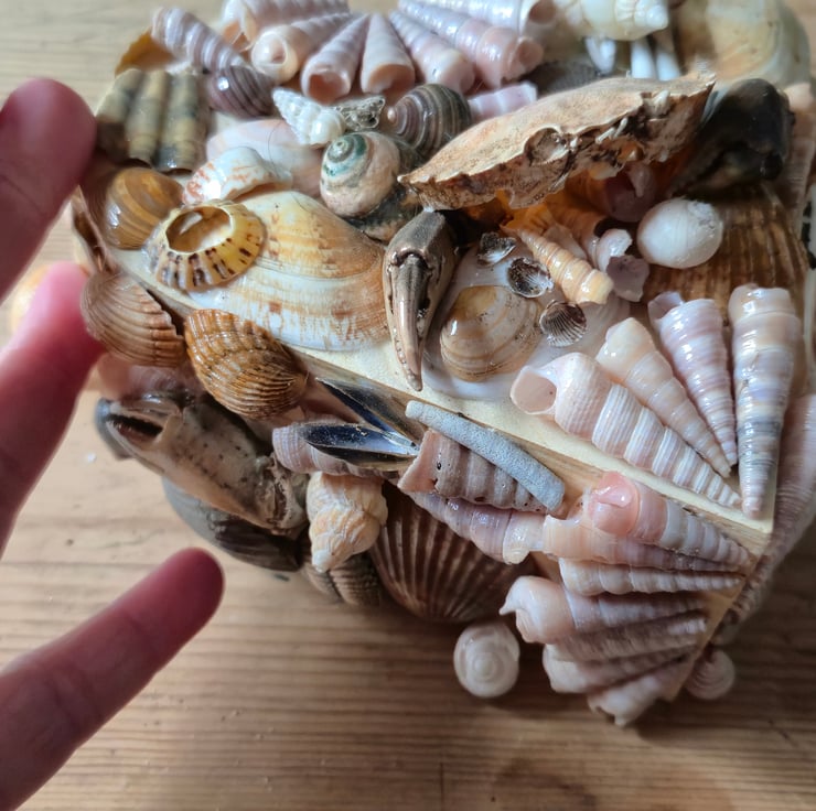 Shells collected from a North Wales beach, decorated onto a wooden box for display, or use as a keepsake box or whatever you would like.heart shaped box