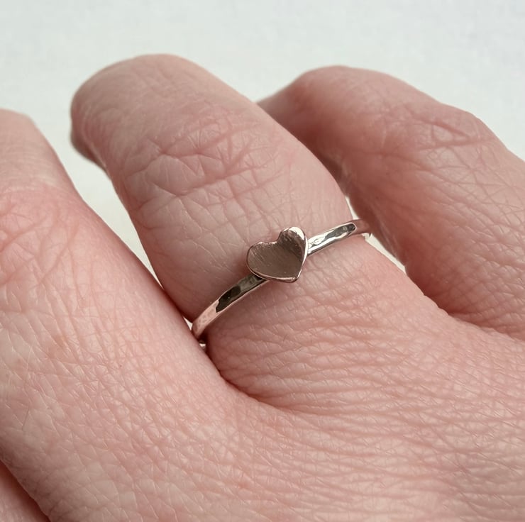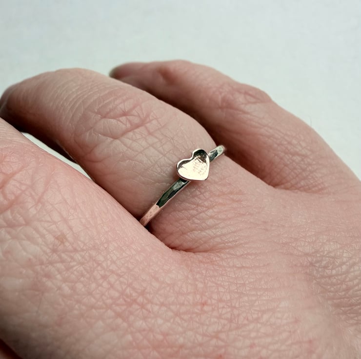 A handmade hammered silver ring finished with a dainty copper heart