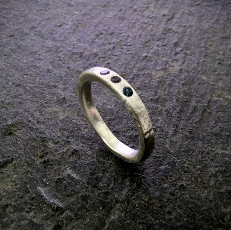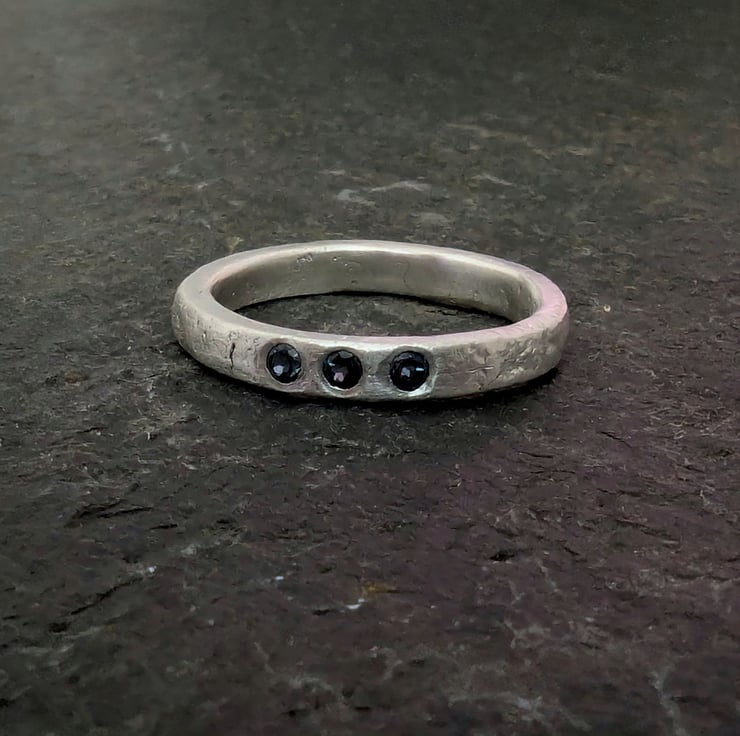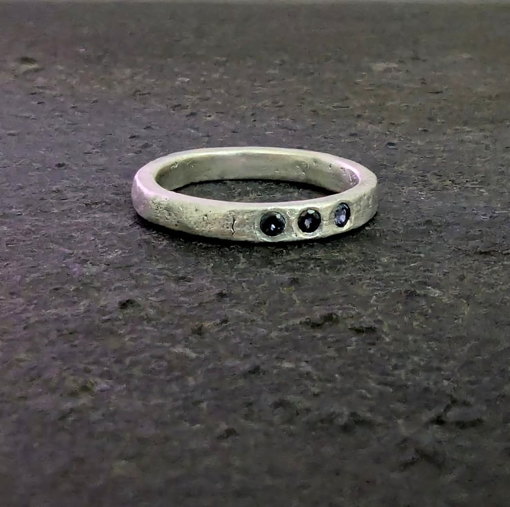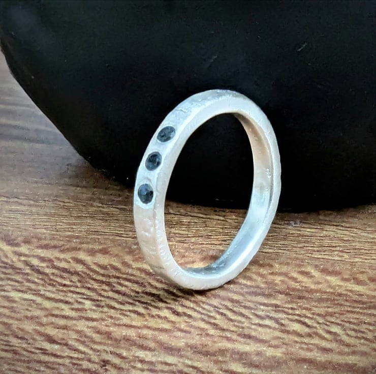 Textured silver band with a heat flame texture (reticulated) heating the metal until it starts to bubble and breakdown, then immediately take away the flame. giving the ring a unique organic contemporary look.