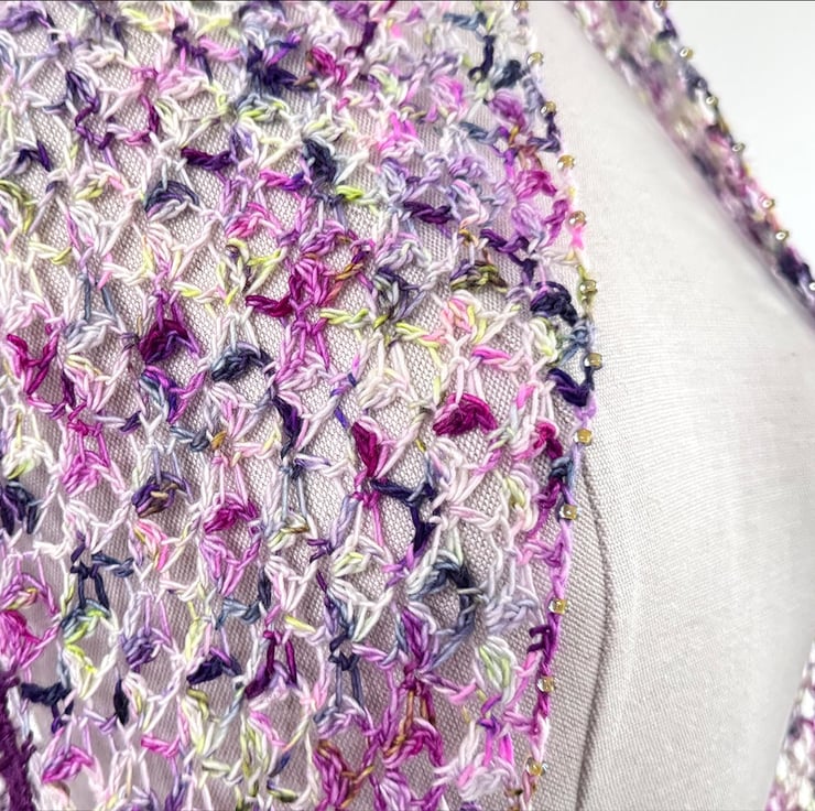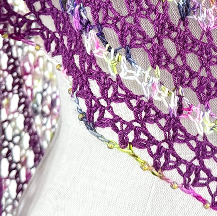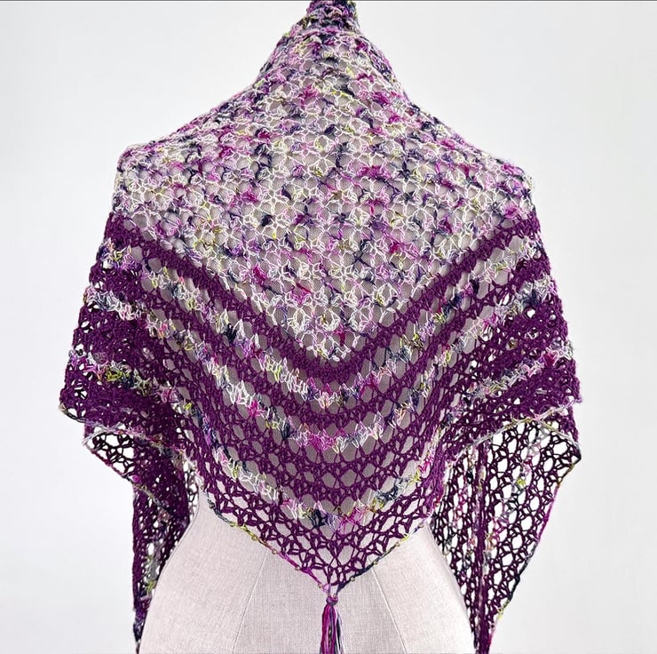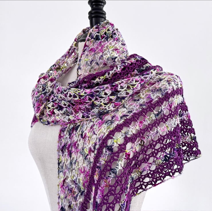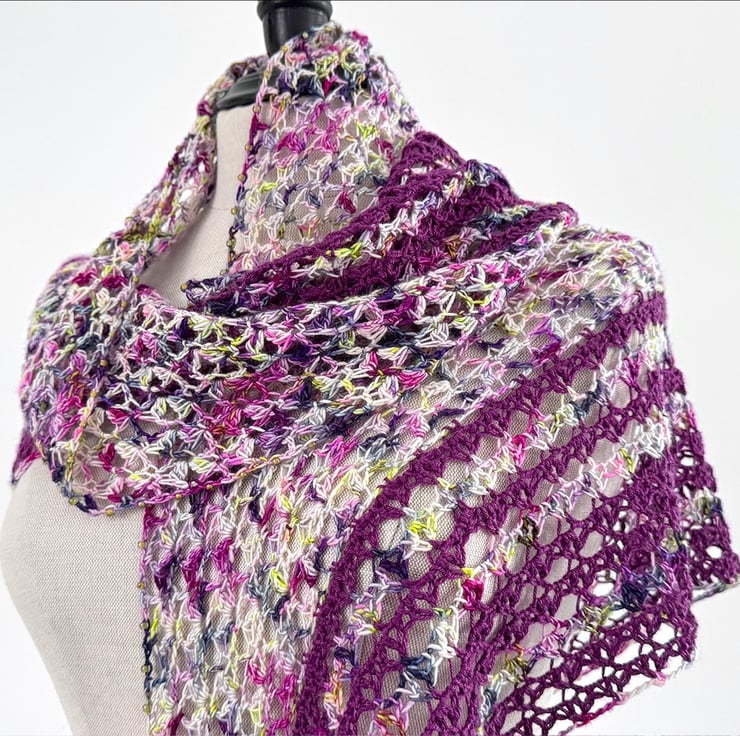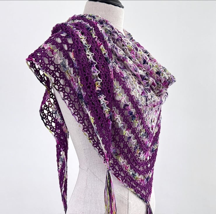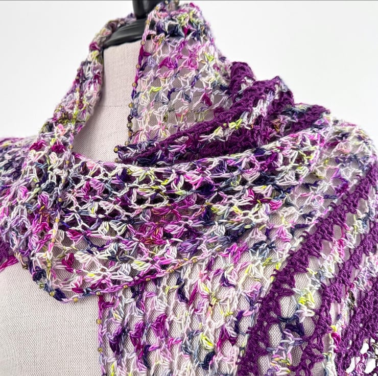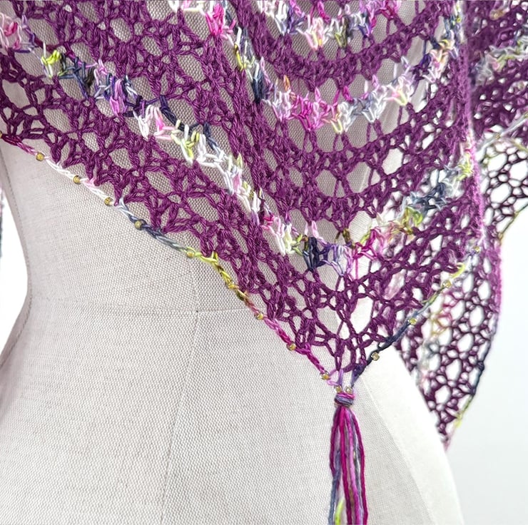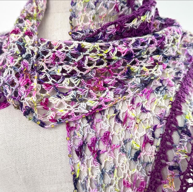 This is a handmade crochet wrap made from a gorgeous vibrant variagated hand dyed merino yarn together with a purple silk and merino yarn. The lacey striped section is edged with glass beads and features three tassels. It is beutifully soft and has a lovely vintage boho feel.