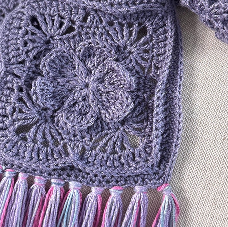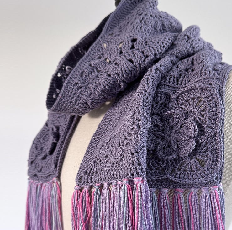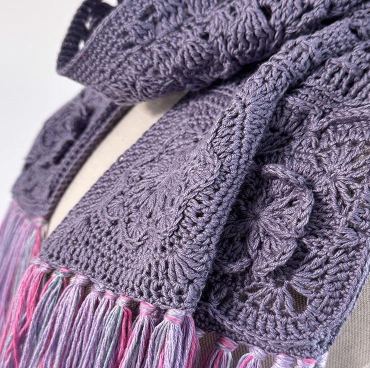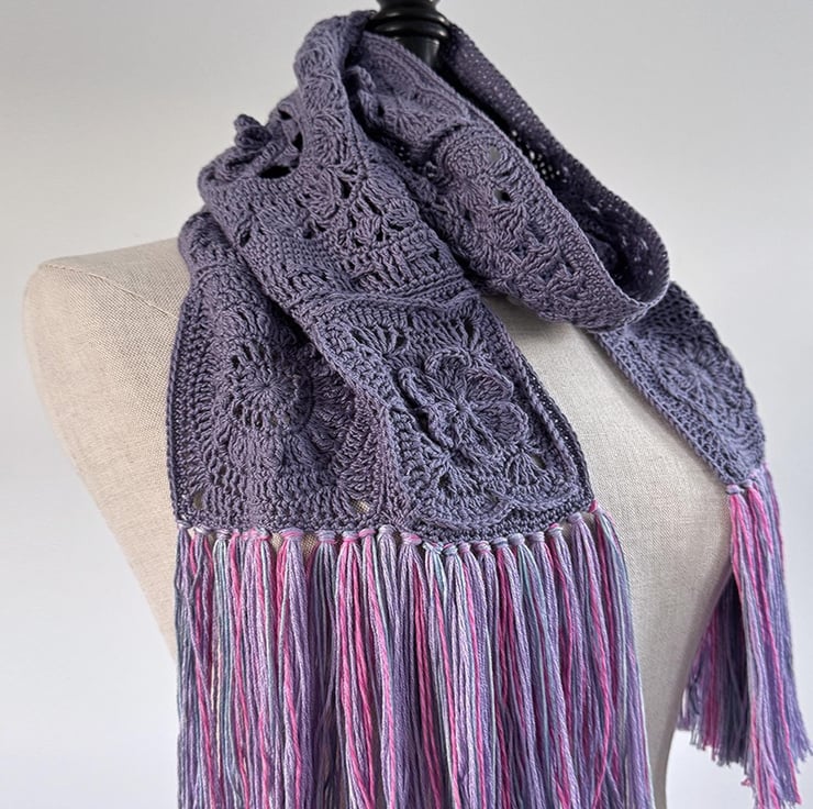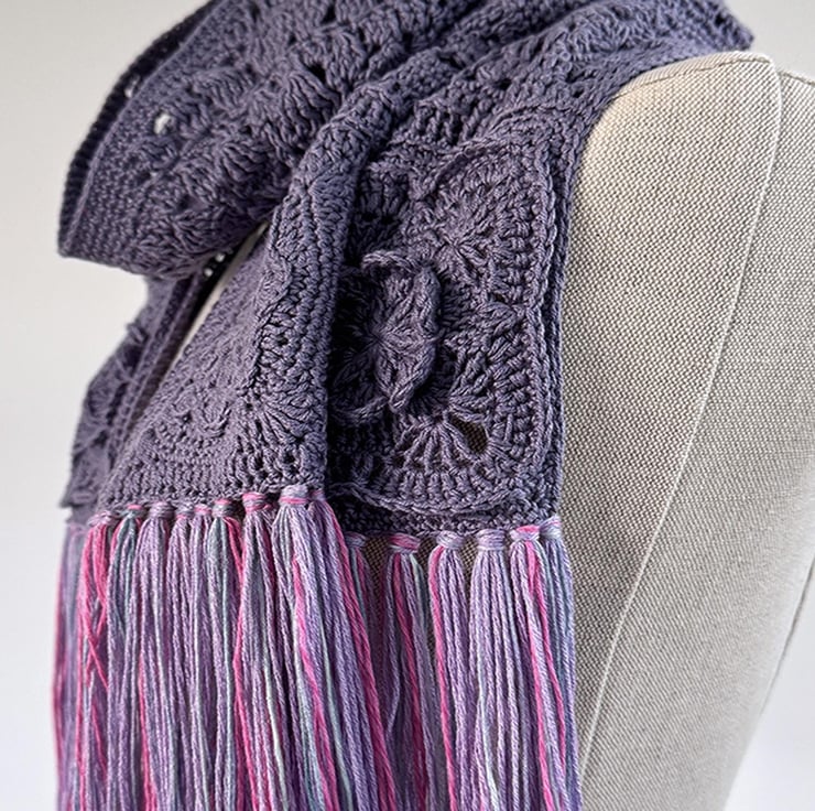 This scarf is made from individual granny squres with different designs. some are three dimensional, some lacey The main body of the scarf is crocheted in a soft and drapey yarn of 50% acrlic50% cotton. The fringe has various yarns of different pinks, lilac and purples. It is a retro, boho design with a statement fringe.