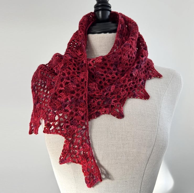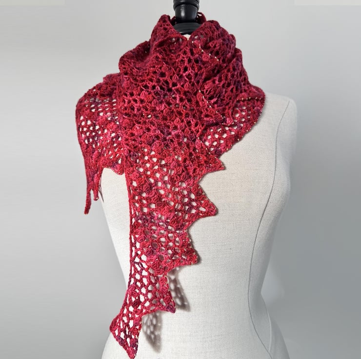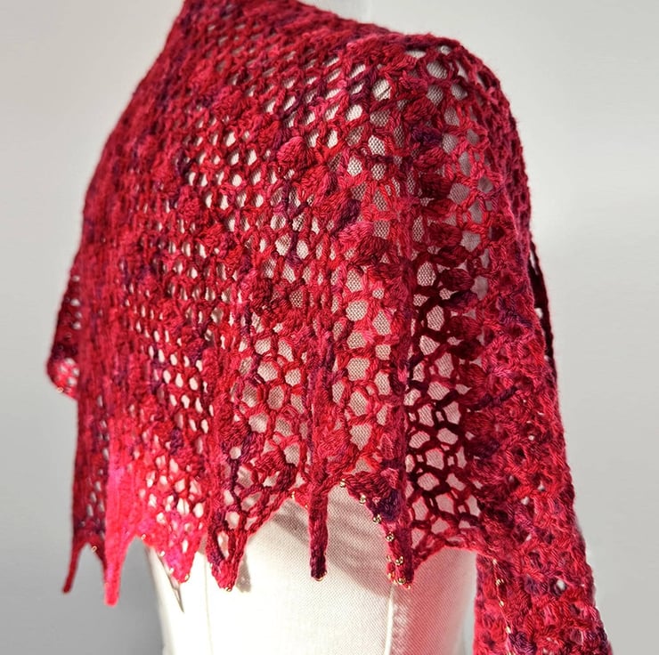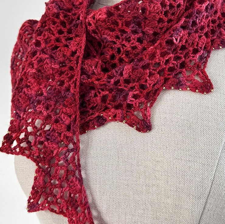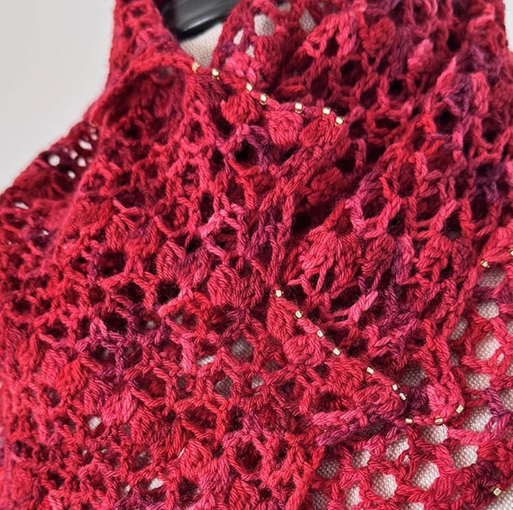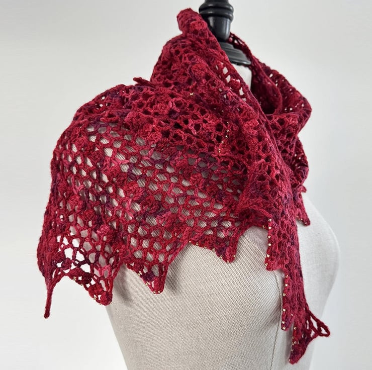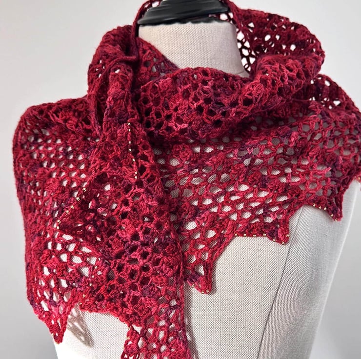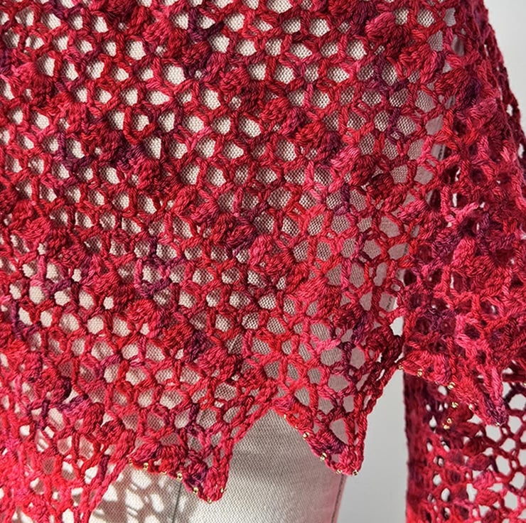 This is a handmade asymmetrical crochet shawl. It features a dragon tail edge design in a variegated red merino wool. The edge is highlighted with gold glass beads.