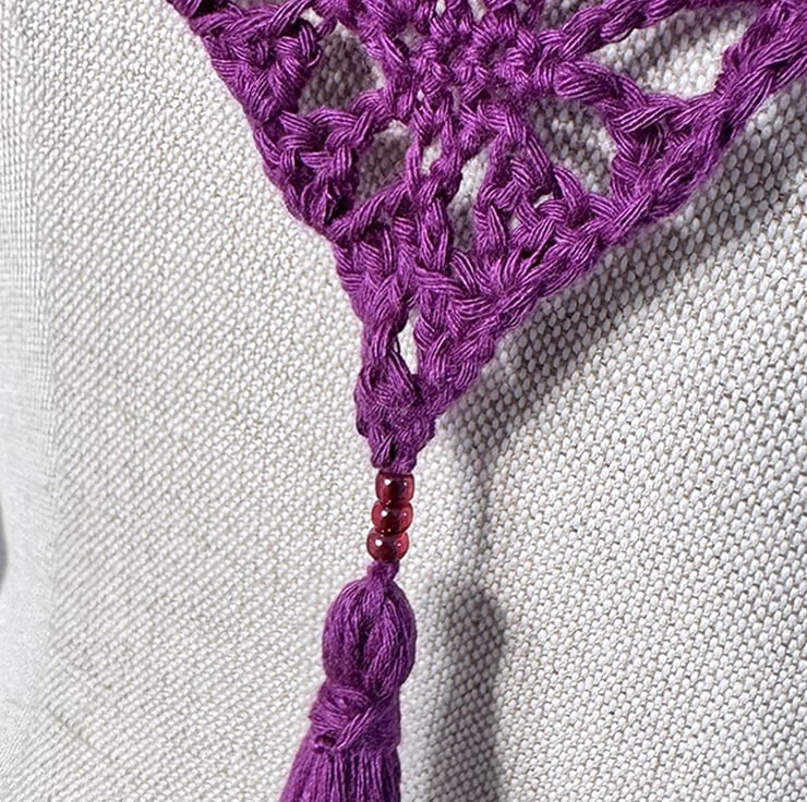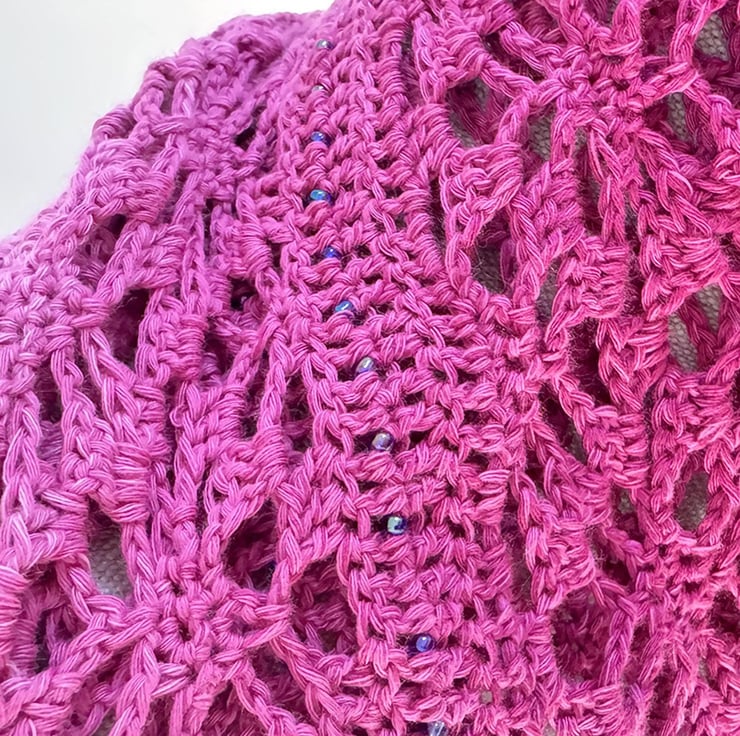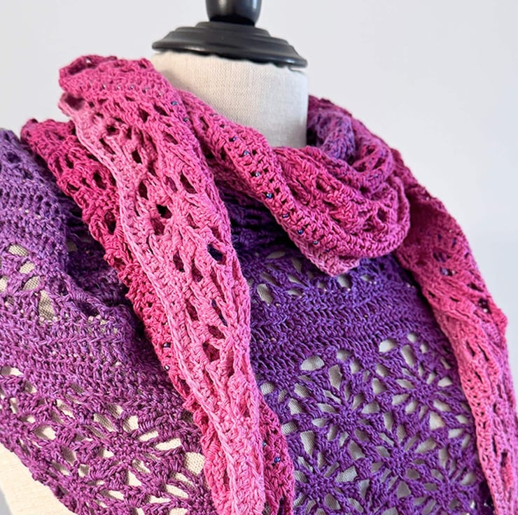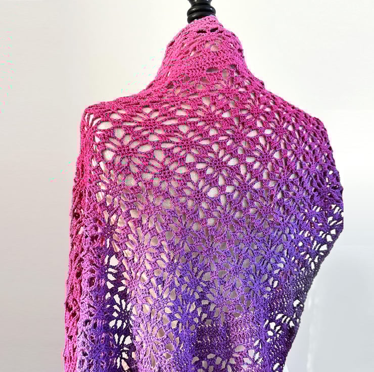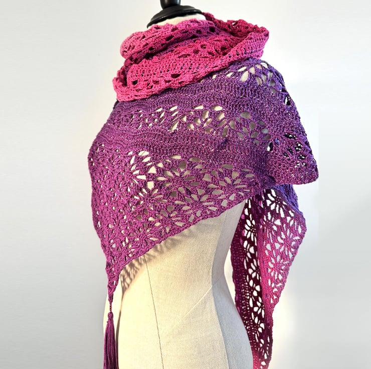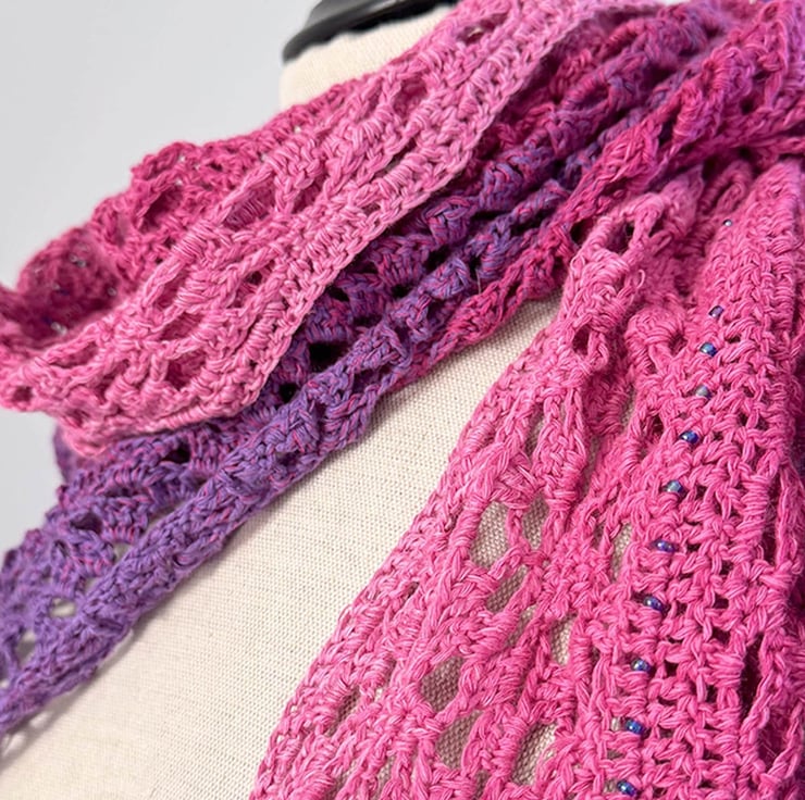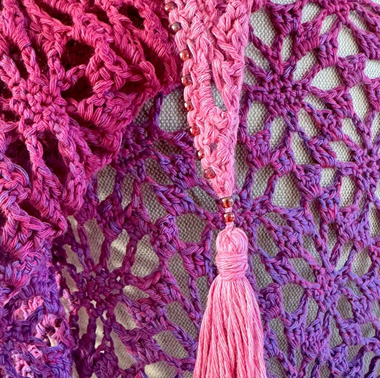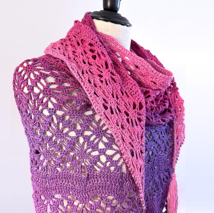 This is a large handmade crochet wrap that graduates from a grgeous deep green teal to a vibrant summer turquoise. Embellished with Toho glass beads along the entire length of bottom edges for added impact.